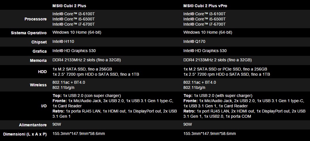 MSI è lieta di annunciare il nuovo mini-PC della propria linea: MSI Cubi 2 Plus. Il Cubi 2 Plus è costruito per essere - a dispetto delle ridottissime dimensioni - il punto d'incontro tra le necessità business e le necessità consumer, concentrando tutto ciò che è necessario nel palmo di una mano. La nuova generazione di Cubi dispone di una nuova scheda madre STX (5x5); la scheda madre STX del Cubi è più piccola del 29% rispetto alle già ridotte schede mini-ITX, rendendo la piccola STX la scheda più compatta con una cpu non saldata. Grazie all'uso di CPU Skylake-S, aggiornabili, non solo il Cubi 2 Plus dispone di maggior potenza e minori consumi rispetto al passato, ma anche della possibilità di vedersi aggiornato in tutte le sue parti.