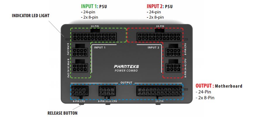 Il PH-PWCOB_2P1M, questo è il nome in codice del prodotto, misura 165mm x 32mm x 100mm (WxHxD), è in plastica ABS, funzonamento plug&play e può ricevere potenza da due collegamenti a 24-pin e da quattro a 8-pin, per poi combinare il tutto in un'uscita da 24-pin e due da 8-pin. La potenza in uscita, destinata quindi alla sola scheda madre, è di 1170 Watt. Il Power Combo può essere fissato all'interno di un case come il Phanteks Enthoo Primo che è in grado di ospitare due alimentatori.