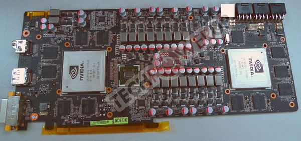 Il noto sito Techpowerup ha pubblicato un'immagine in cui é possibile intravedere le due gpu collegate da un chip nForce 200 per gestire lo SLI interno. La specifiche tecniche rimangono invariate e troviamo quindi un bus di memoria a 384bit per 1536MB di GDDR5. Il pcb é costruito con 3 once di rame per garantire una buona stabilità elettrica alla scheda che richiederà 3 connettori da 8pin ciascuno.