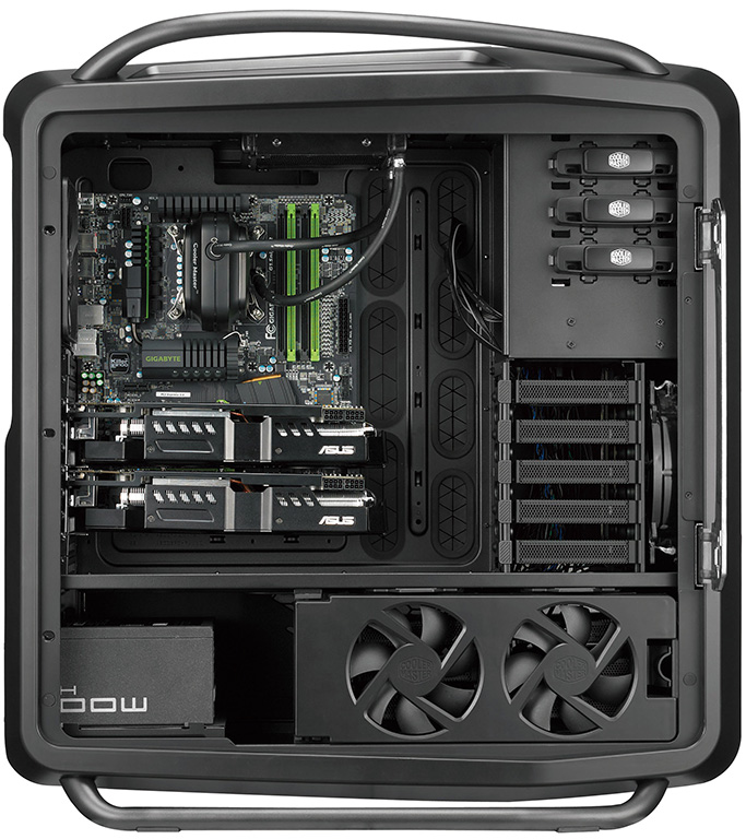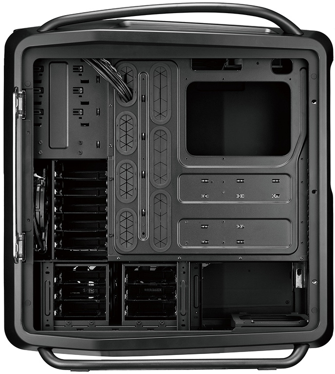 Internamente il Cosmos 2 è semplicemente immenso, con spazio fino a 10 ventole, 13 HDD, configurazioni 4-way SLI e Crossfire con schede video lunghe fino a 385mm. Ben 10+1 (per estensioni aggiuntive) gli slot PCI disponibili.