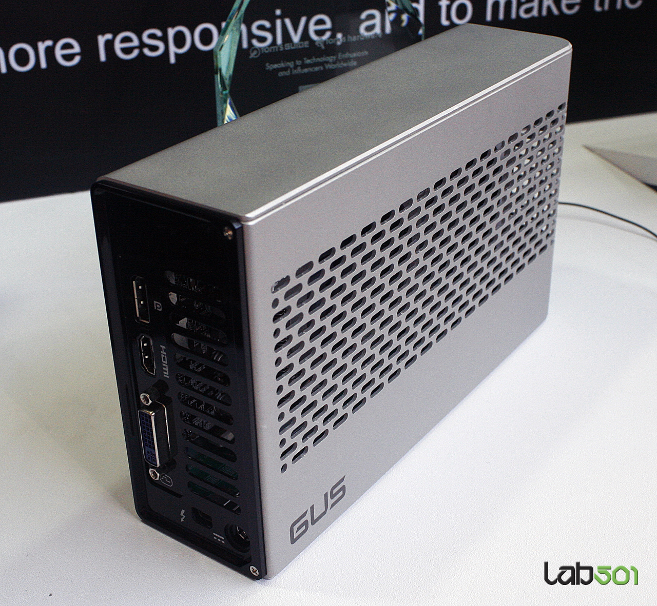Il box viene collegato al notebook con la connessione Intel Thunderbolt che assicura una velocità di trasmissione dati fino a 10 Gbps per canale. Il GUS II offre all'interno un connettore PCI-Express x16 per GPU dedicate con le quali si potranno incrementare, oltre che le prestazioni, anche altre funzioni, come per esempio un sistema multi monitor.