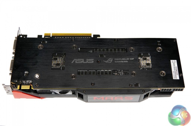 Sul lato si può scorgere la scritta MARS che si illumina di rosso una volta acceso il computer e il connettore SLI, che permette di collegare una scheda identica per formare un quad-SLI.
