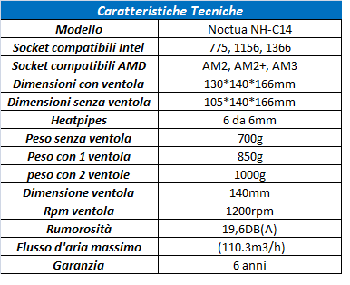 In questa tabella andiamo a riassumere le caratteristiche tecniche del Noctua NH-C14.