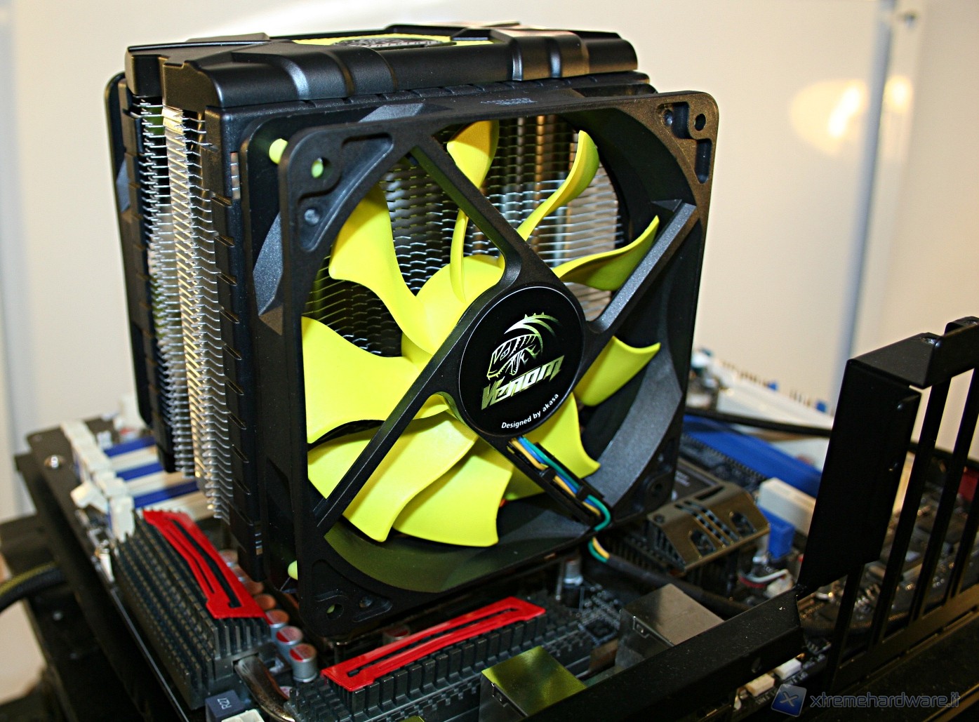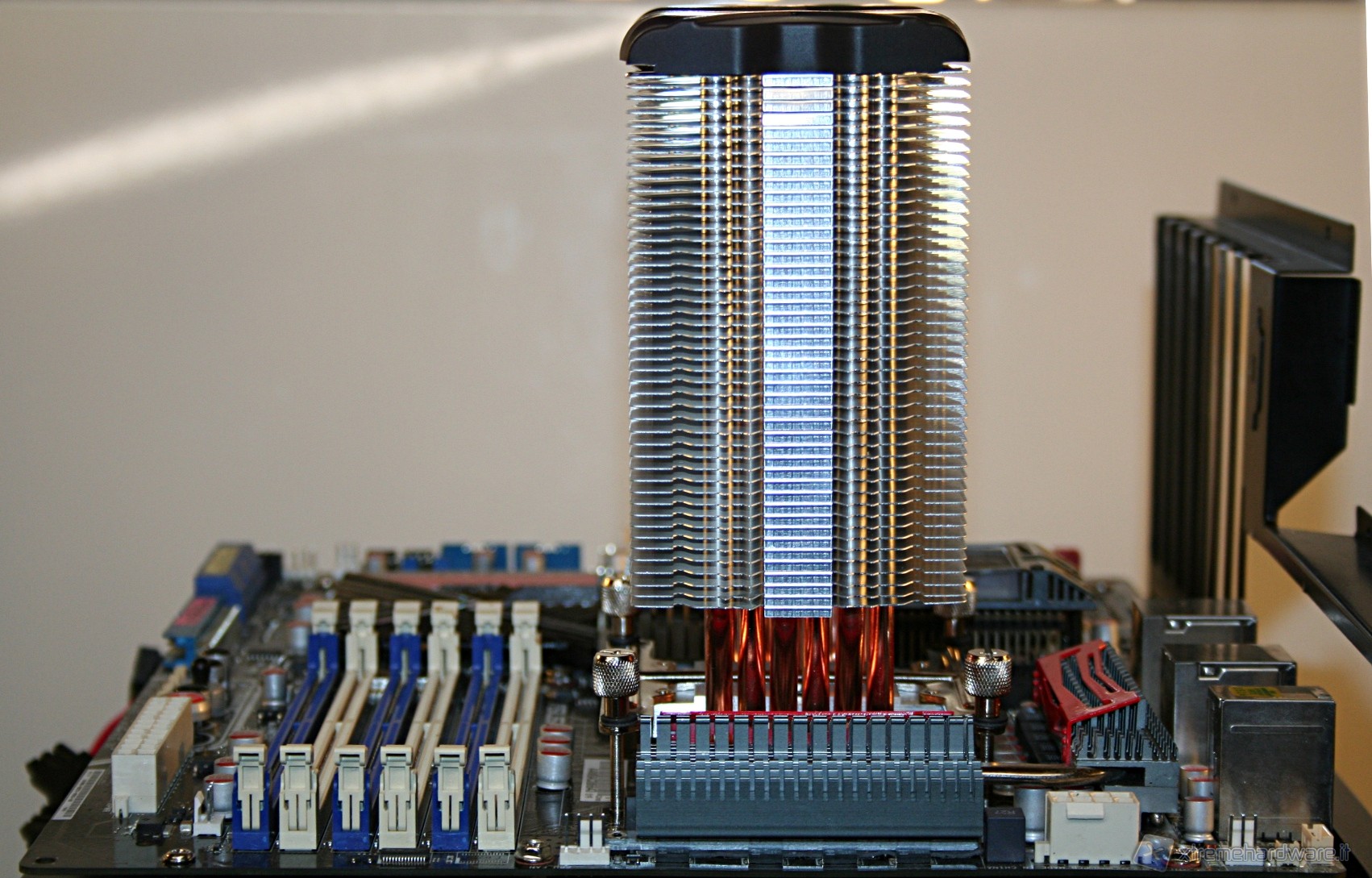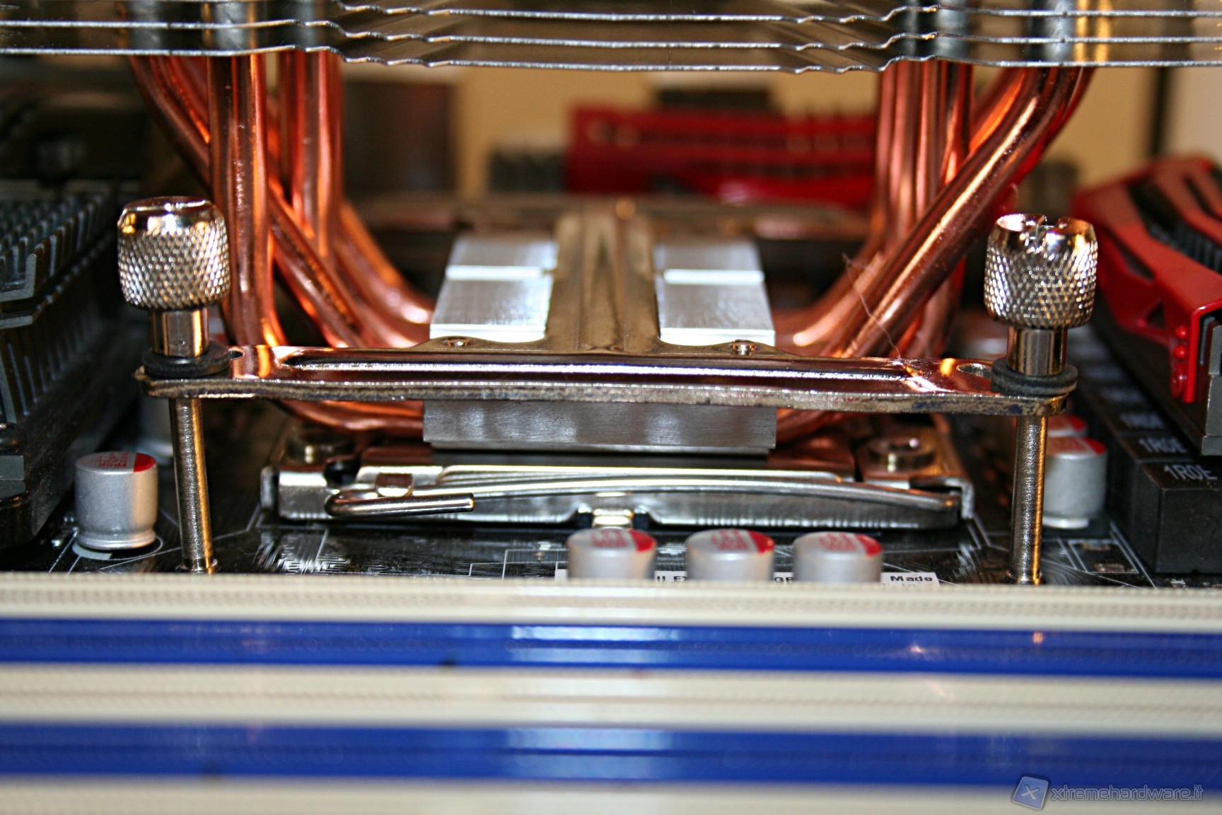 Il montaggio è facile ed è tutto molto stabile, una volta completata l’operazione. Unica nota negativa, sebbene le dimensioni complessive risultino contenute, è che montando la ventola da 120mm in configurazione Push, ovvero come viene fornita di fabbrica, si va ad ostruire il primo banco di RAM, se queste ultime sono ad elevato profilo. E’ eventualmente possibile installare la sola ventola in configurazione pull, permettendo così di popolare tutti i sei slot di RAM disponibili. Facciamo notare inoltre che il montaggio è stato effettuato su una ASUS X58 P6T Deluxe V2: in altre schede madri in cui la distanza degli slot dal socket è inferiore, la ventola potrebbe interferire con altri slot addizionali anziché solo il primo. Abbiamo posizionato il dissipatore con la ventola in immissione rivolta verso i banchi di RAM. Questa è la configurazione migliore in un cabinet poiché si crea un flusso che tende a spingere l’aria calda verso l’esterno, omogeneo con quello creato dalle altre ventole presenti nel case.
