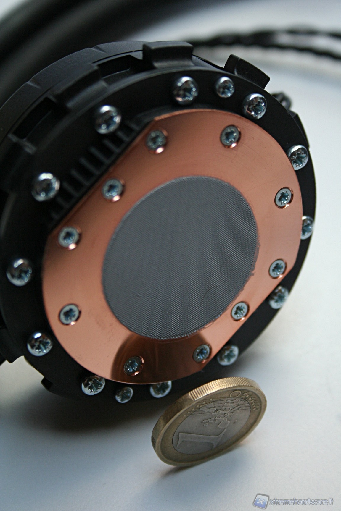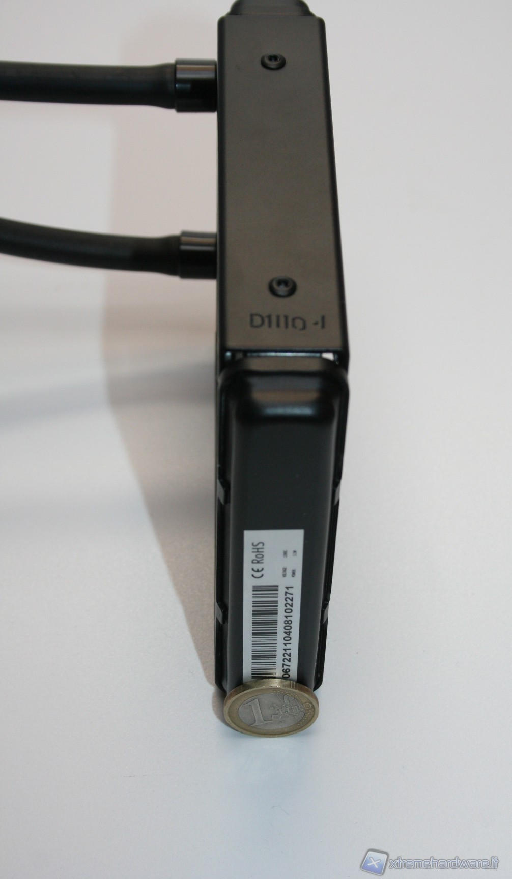 Il dissipatore, per chi non conoscesse la tipologia in questione, si presenta come un corpo radiante della larghezza ed altezza grossomodo di una singola ventola da 120mm, questo significa che sarà compatibile con la quasi totalità dei case ATX. Lo spessore del radiatore è di soli 27mm, rendendo l’installazione molto più agevole rispetto al KÜHLER 920. Dal radiatore partono due tubi contenenti del liquido refrigerante, sostanzialmente acqua e sostanze sia anticorrosive che antibatteriche, che finiscono la loro corsa all’interno di una struttura circolare, costruita dall’eccellente ditta Asetek, che funge sia da waterblock che da pompa. Le particolarità di questa soluzione sono molteplici, ma andiamo per ordine: