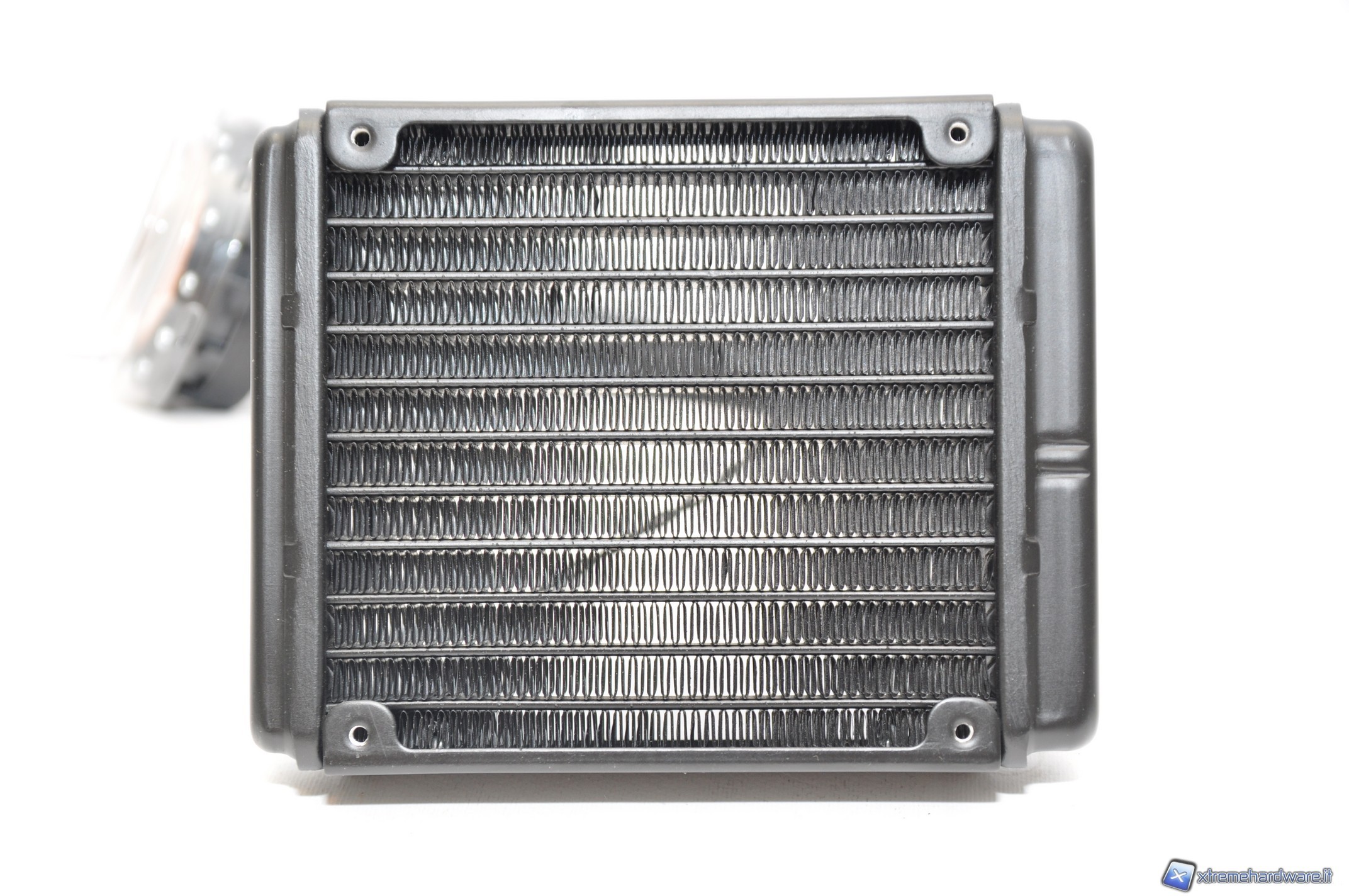 Partendo da questi presupposti analizziamo la struttura stessa del radiatore. Ottimo l’assemblaggio, molto solido e non eccessivamente pesante, presenta 4 fori su ciascun lato lato per l’installazione di due ventole da 120mm, ricordiamo però che in dotazione ne viene fornita una sola. Le lamelle non sono eccessivamente spaziate, ciò implica una maggiore superficie dissipante ma allo stesso tempo ostacola il passaggio dell’aria, rendendo teoricamente necessari alti regimi di rotazione per le ventole. In fase di test abbiamo tuttavia rilevato un’ottima efficienza anche a bassi regimi di rotazione.