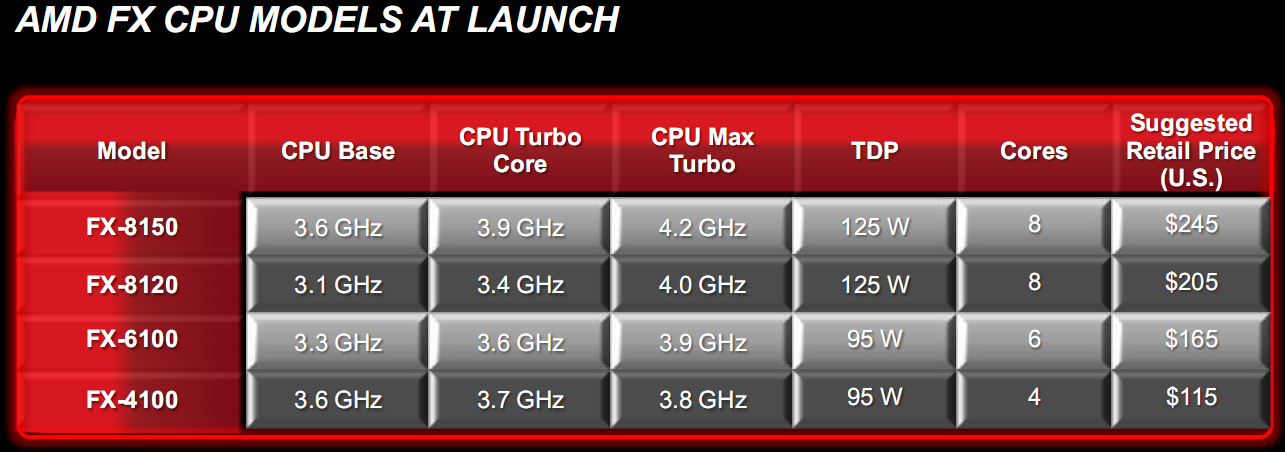 In figure one can see the overview of the various Bulldozer CPUs available from October 12, 2011. As you can see there are 4 models in the 8xxx FX series at 125W and 95W of 8-core (the FX 8150, FX 8120 and FX 8100), a 6-core model of 6xxx FX series (FX 6100) and three 4-core models 4xxx FX series (models FX 4170, FX B4150 and FX 4100), with the frequency record for the desktop CPU as the CPU FX 4170 has 4.2GHz, which will be introduced later.