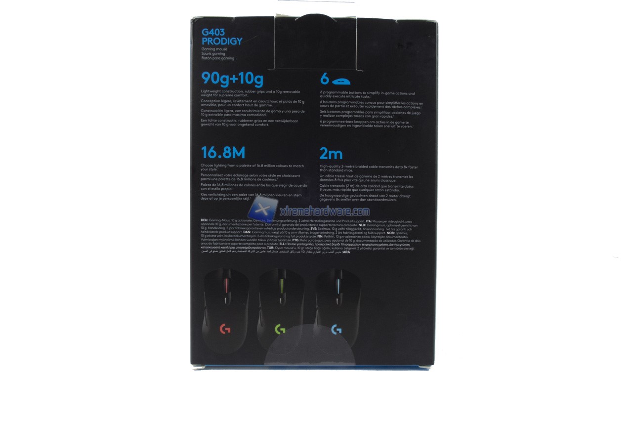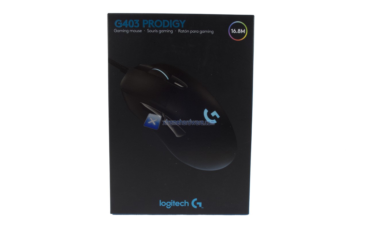 La confezione in cartone di medie del Logitech G403 Prodigy è a tema Logitech G con la classica colorazione Nero e Azzurro. Vengono riportate al solito diverse informazioni in diverse lingue tra cui l’italiano, caratteristiche e immagini illustrative.