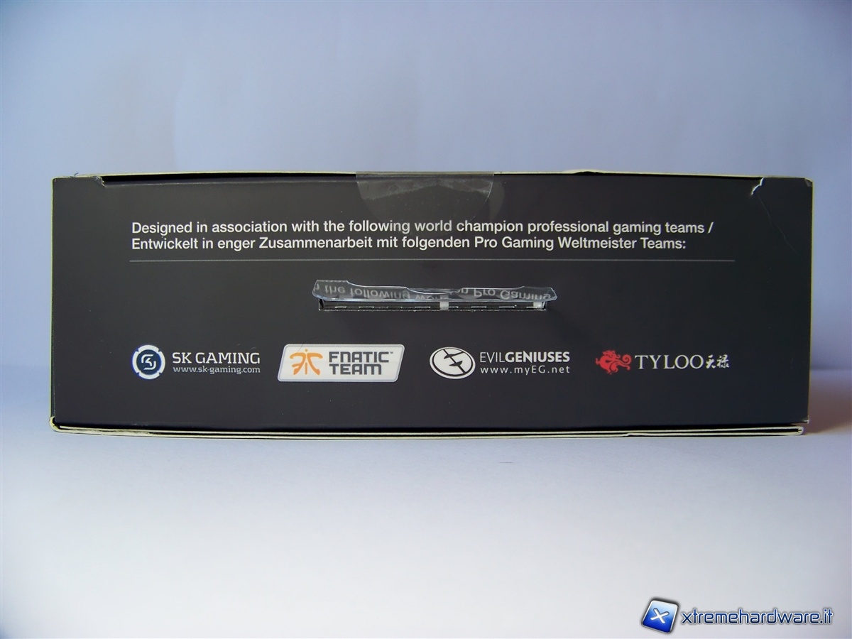 Aprendo il frontale della scatola possiamo ammirare il mouse al completo, mentre sulla metà di sinistra troviamo i commenti positivi di alcune redazioni del settore e le opinioni di due giocatori professionisti.