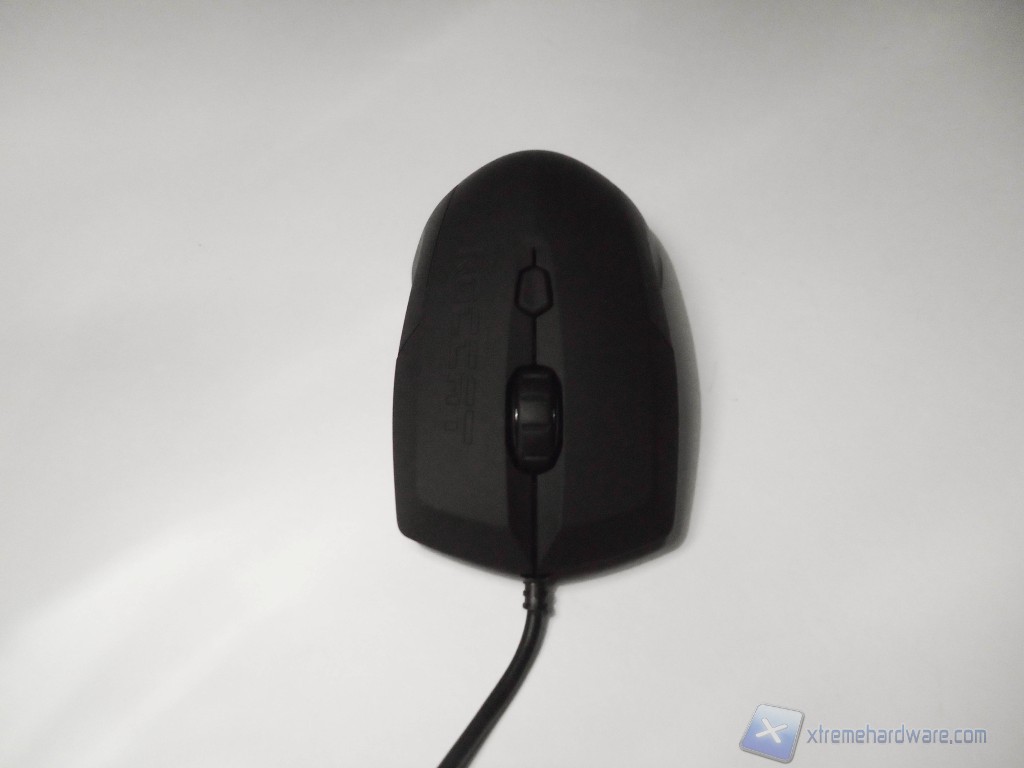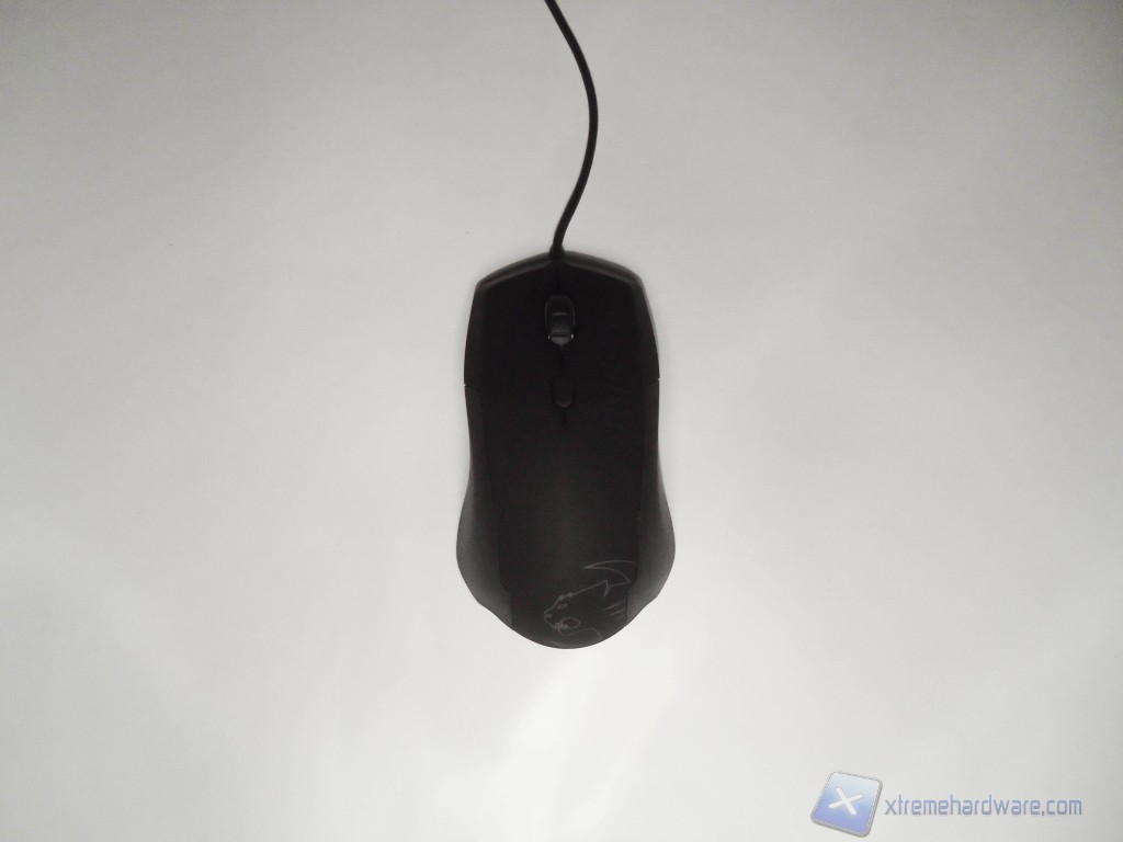Osservando il mouse dall’alto notiamo la sua forma simmetrica in quanto è stato progettato sia per destri che mancini. Il mouse è interamente di colore nero e sulla parte superiore, che è rivestita in plastica soft-touch, troviamo impresso anche il logo Roccat.