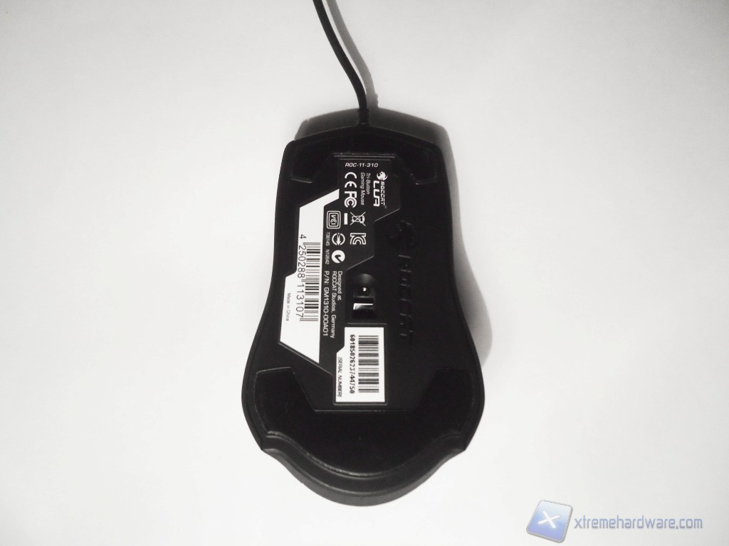 Sulla parte posteriore del mouse troviamo il logo Roccat che si illumina di una luce blu. Il sistema di illuminazione è personalizzabile su 3 livelli: fisso, pulsante e spento.