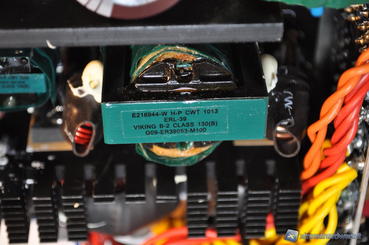 Il trasformatore è ben protetto da una guaina termo restringente e appartiene a CWT, azienda che produce l’interno degli alimentatori delle principali marche più blasonate, quali Enermax, Corsair et cetera. E’ possibile notare in questa immagine che al suo interno è presente un piccolo fascio di conduttori. Questo modello non è assemblato con un telaio in lamierini ma in ferrite, cosa che permette di evitare tutti quei fastidiosi effetti di risonanza. Il compito del trasformatore è quello di trasformare la corrente che gli arriva in alta tensione, in bassa tensione. A sinistra troviamo il trasformatore pilota, utilizzato per l’alimentazione del computer in stand-by.