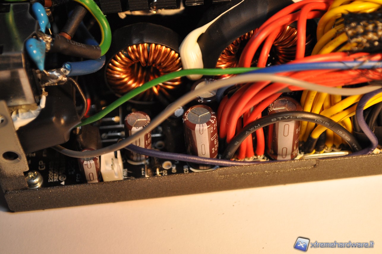 In questa immagine è possibile vedere due bobine (chiamate anche induttanze) in cui transita al loro interno una corrente raddrizzata ma pulsante. Queste bobine sono avvolte su un nucleo toroidale e coperte in cima da una guaina nera termorestringente. Quelle in foto sono bobine di modeste dimensioni, adatte per alimentatori di erogazione abbastanza alta, circa 700/800W. E’ interessante far notare come in questo alimentatore quasi tutte le bobine siano protette, ciò significa un’ottima qualità costruttiva sotto questo aspetto.