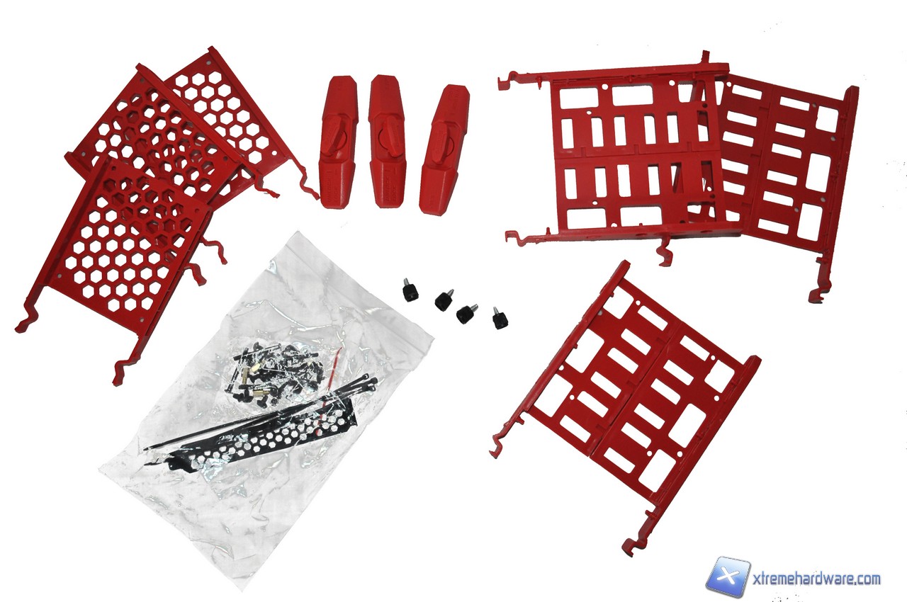 Iniziamo ad analizzare il prodotto partendo dal bundle. Assieme al case troviamo tutte le viti necessarie per installare i nostri componenti, ci sono poi una serie di fascette in plastica per il cable management ed infine, già installate all'interno del cabinet, tre ventole da 120mm di cui 2 con LED rosso e pulsante d'accensione sul pannello frontale; le ventole sono di produzione Itek. Ci sono ovviamente le varie slitte in plastica per installare gli hard disk o gli SSD, le prime dotate di blocco ad incastro e sistema antivibrazione mentre le seconde necessitano delle classiche viti per il fissaggio. Il bundle non è amplissimo ma comunque buono, pienamente in linea con quanto offerto anche dalla concorrenza.