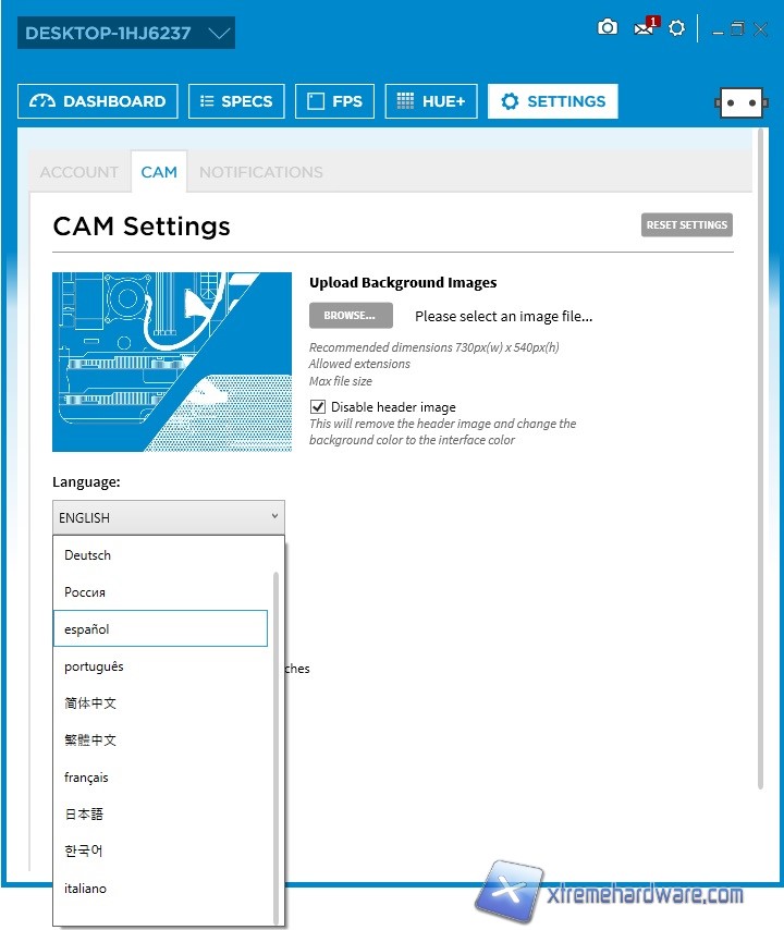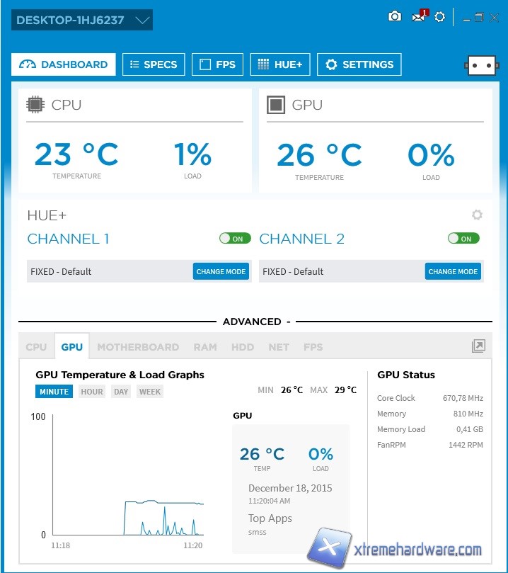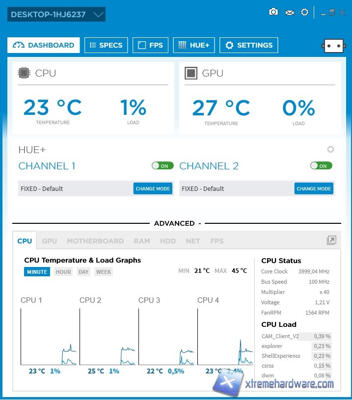 Avviato il software ci troveremo di fronte una grafica ben organizzata e chiara. Avremo inoltre la possibilità di cambiare il colore di background, nel caso non vi piacesse, tramite le impostazioni presenti nell’ultima Tab ‘’Settings’’. Stessa cosa con la lingua. NZXT CAM nel corso dei mesi e degli anni è stato rivisto e migliorato infatti dalla serie Kraken ad oggi l’interfaccia ha molte più informazioni, impostazioni e valori di lettura. Il layout grafico è ben strutturato. In alto avremo il nome del nostro PC con alcune icone che ci permetteranno di fare uno screenshot, di modificare e di controllare aggiornamenti o la versione attuale del software e molto altro ancora. Quasi al centro troviamo 5 Menù che sono ‘’Dashboard’’, ‘’Specs’’, ‘’FPS’’, ‘’HUE+’’ e ‘’Settings’’. Partendo da ‘’Dashboard’’ troviamo diversi valori di lettura inerenti i componenti installati nel nostro sistema. I due grafici più grandi riporteranno la temperatura ed il carico della CPU e della GPU. A seguire le impostazioni HUE+ che vedremo a breve ed altri grafici con i valori circa i restanti componenti della nostra configurazione.
