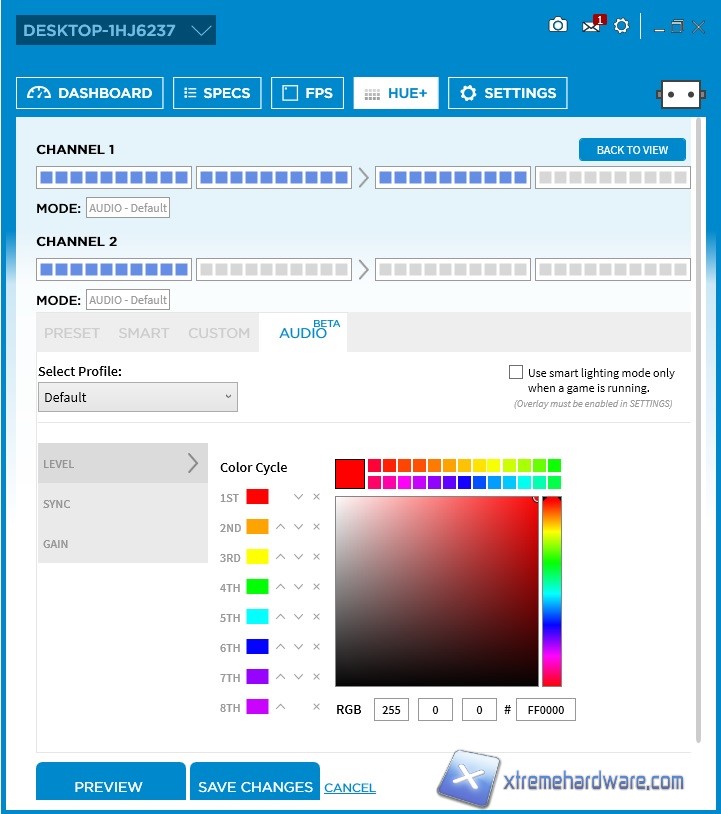 Come possiamo vedere dalle immagini a seguire, potremo configurare diversi effetti visivi come ‘’Fixed’’, ‘’Breathing’’, ‘’Fading’’, ‘’Marquee’’, ‘’Covering Marquee’’, ‘’Pulse’’, ‘’Spectrum Wave’’, ‘’Alternating’’, ‘’Candle Light’’. Tutti questi effetti modificabili in diversi colori permetteranno di selezionare l’effetto migliore per la nostra build. Non finisce qui la possibilità di personalizzare il sistema HUE+, infatti la Tab ‘’Preset’’ raccoglie gli effetti visivi classici impostabili ma spostandoci nelle altre Tabs sempre del Menù ‘’HUE+’’ potremo agire ad esempio su un’impostazione di colore per segnalare un eventuale aumento di temperatura per la CPU o la GPU, o ancora in gioco. Infine l’NZXT HUE+ introduce anche l’Audio Visualizer forse una delle funzioni più interessanti offerte dal controller. Selezionandola e scegliendo i diversi colori in scala, una volta avviato un brano con ad esempio bassi profondi otterremo un effetto visivo crescente sulla striscia all’aumenterà dell’intensità sonora. Ovviamente tale funzione funziona a ritmo ed in base ai dBA rilevati nel segnale audio, quindi maggiore saranno questi ultimi maggiore sarà la possibilità di vedere tutti i LED accesi. Funzione davvero ben fatta anche se viene data ancora come fase ‘’BETA’’.