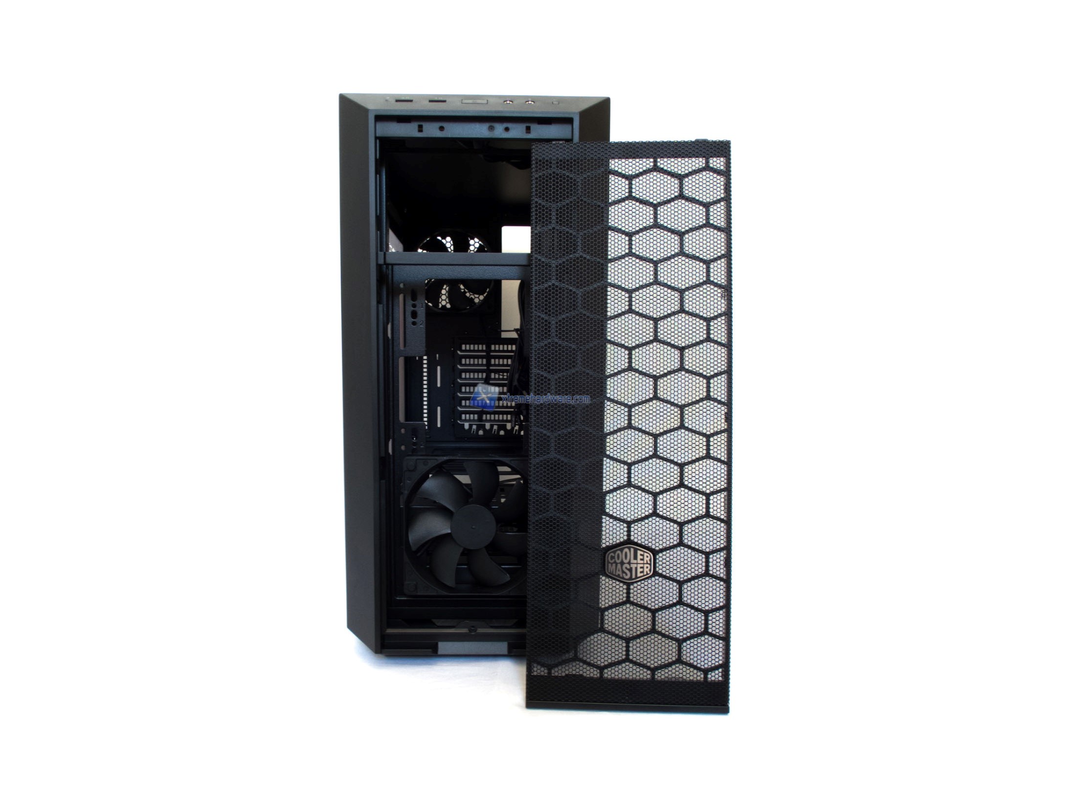 Tornando velocemente alla griglia, inutile dire che questa sarà removibile completamente per accedere alla zona interna del frontale dove potremo notare la prima ventola da 120 mm preinstallata oltre alla possibilità di installarne altre due (di cui quella nel Top tramite un supporto venduto come accessorio e non presente come nel MasterCase 5). Vedremo più avanti anche come tale supporto si potrà tramutare a livello di Liquid Cooling nell’installazione di un radiatore da 360 mm.