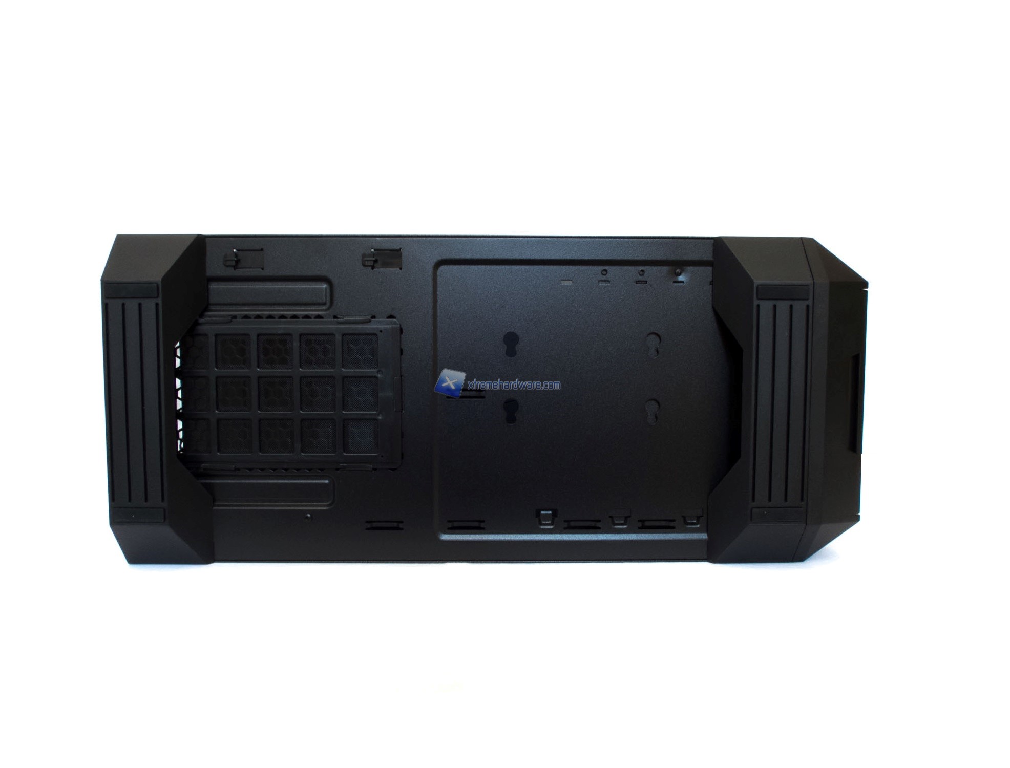 Parlando di alimentatore ci spostiamo dunque nella zona inferiore del case. Qui avremo un ulteriore ‘’dejavù’’ con i modelli MasterCase 5. Il MasterBox 5 infatti adotta come piedini due supporti in plastica di forma squadrata (con un rivestimento di gomma) a seguire il design e linee del case stesso. Nel lato di sinistra troviamo un filtro antipolvere removibile mentre nel lato centrale osserviamo, già ora, i fori per il posizionamento secondario del cage degli Hard Disk all’interno del case.