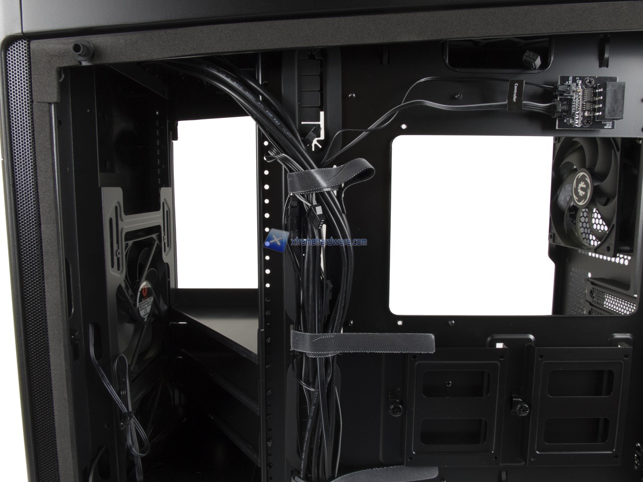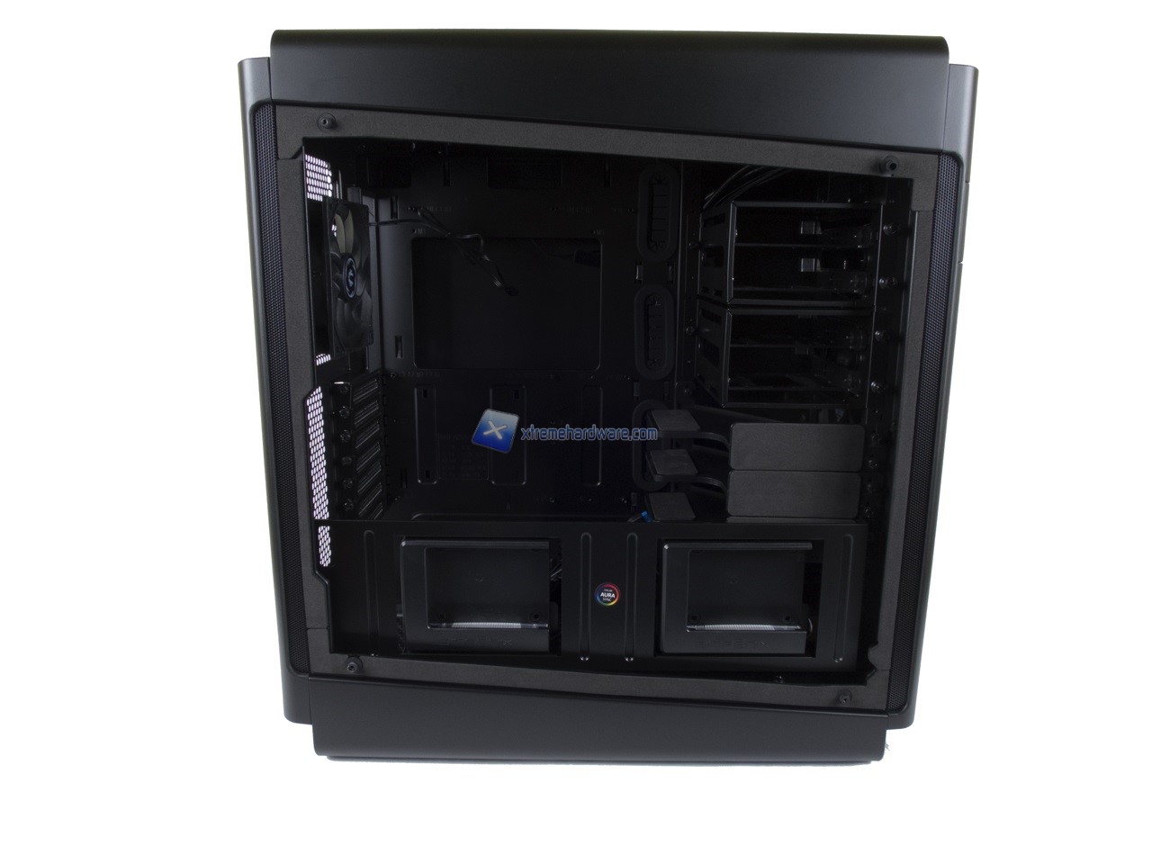 Rimosse le quattro viti per lato e rimossi con estrema attenzione i pannelli di Vetro possiamo dare uno sguardo allo spazio interno che il BitFenix Shogun ci mette a disposizione. Rimosso il pannello che da accesso al Tray della scheda madre possiamo notare subito la quantità di spazio che avremo a disposizione.