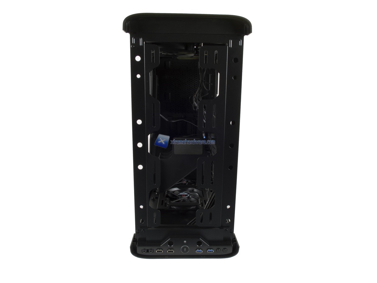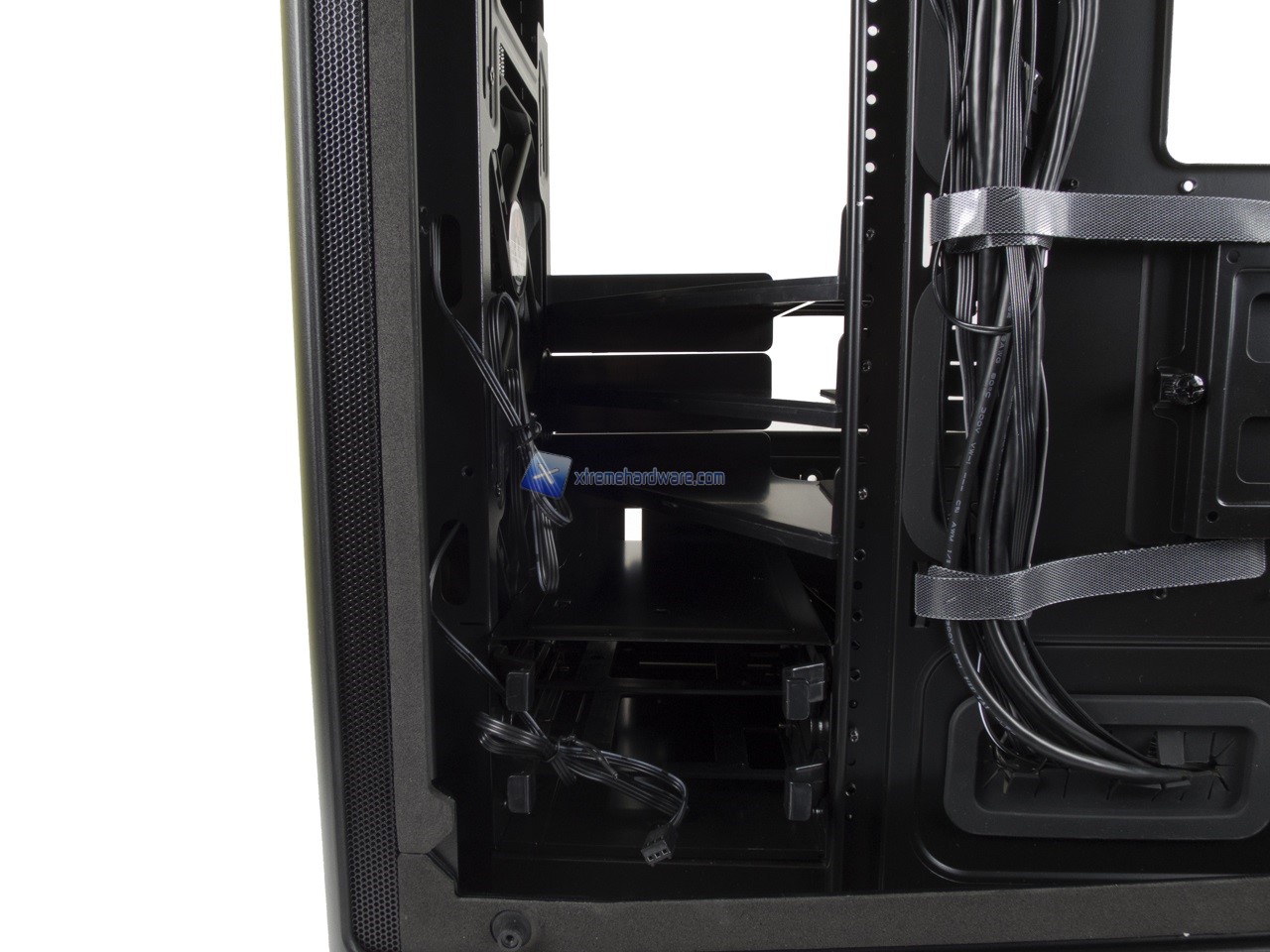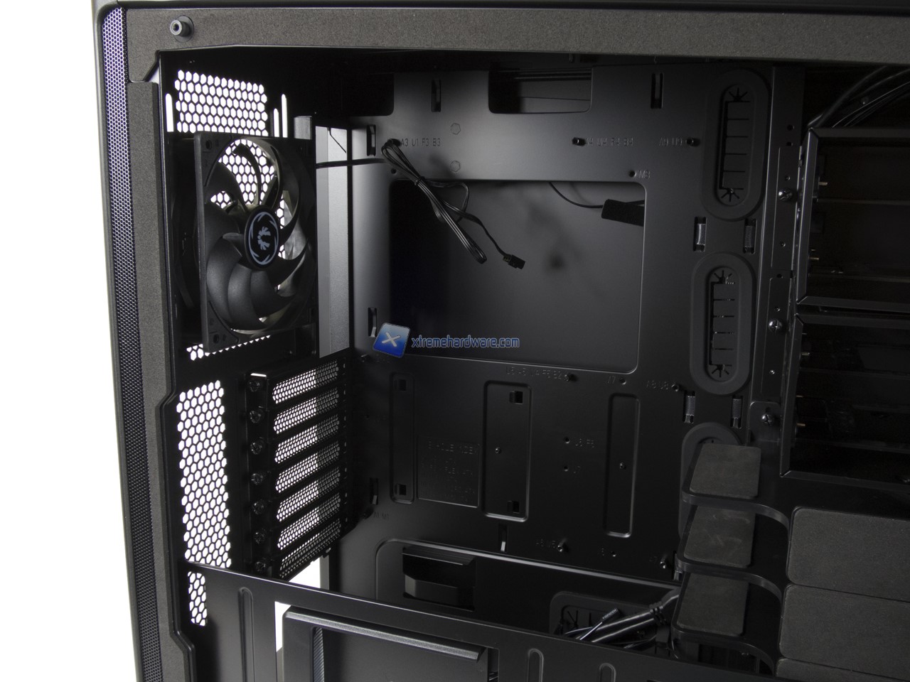Spostandoci nel lato di destra possiamo osservare il classico Tray della scheda madre contornato da diversi fori per il passaggio dei cavi.