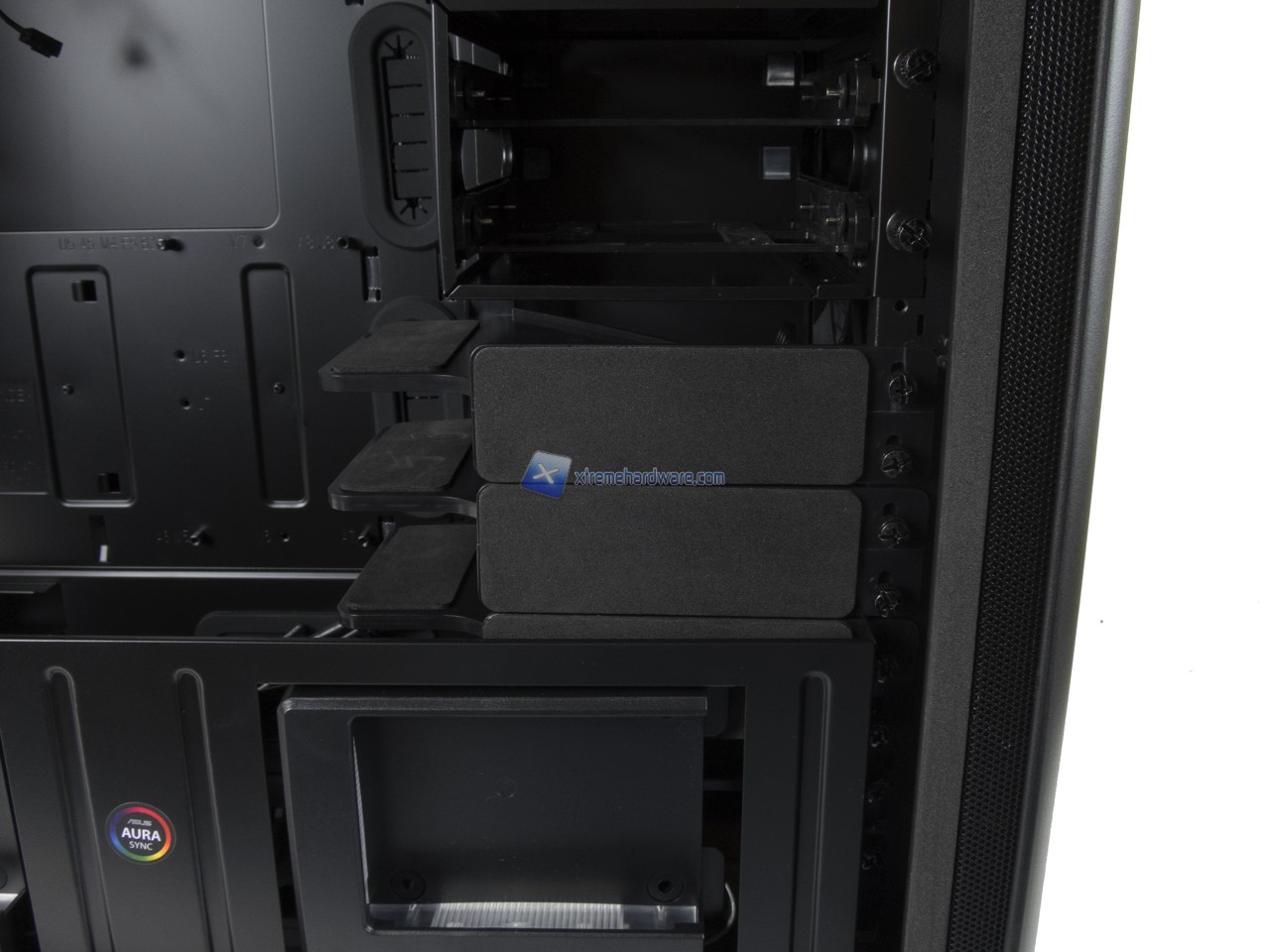 Prima di passare al lato superiore interno vi mostriamo come rimuovendo momentaneamente il supporto SSD Chroma potremo accedere ad un ulteriore Cage per SSD e Hard Disk più un Tray per singolo SSD. Tray che potrà essere rimosso dall’attuale posizione e inserito sul Cage a lato previa rimozione di uno o due supporti GPU Safe. Giusto per dirvi che potrete sfruttare diverse combinazioni di modularità.