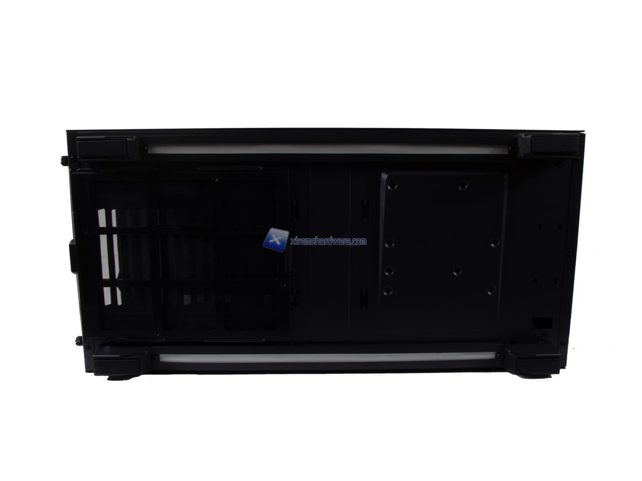 Giungiamo nel lato inferiore del case. Qui non sfugge sin da subito la presenza di due strisce LED, come visto in altri modelli del brand, che completeranno il sistema di illuminazione a LED e personalizzazione del case. Presente un filtro antipolvere in corrispondenza della ventola PSU. I piedini sono in plastica con un inserto in gomma antiscivolo.