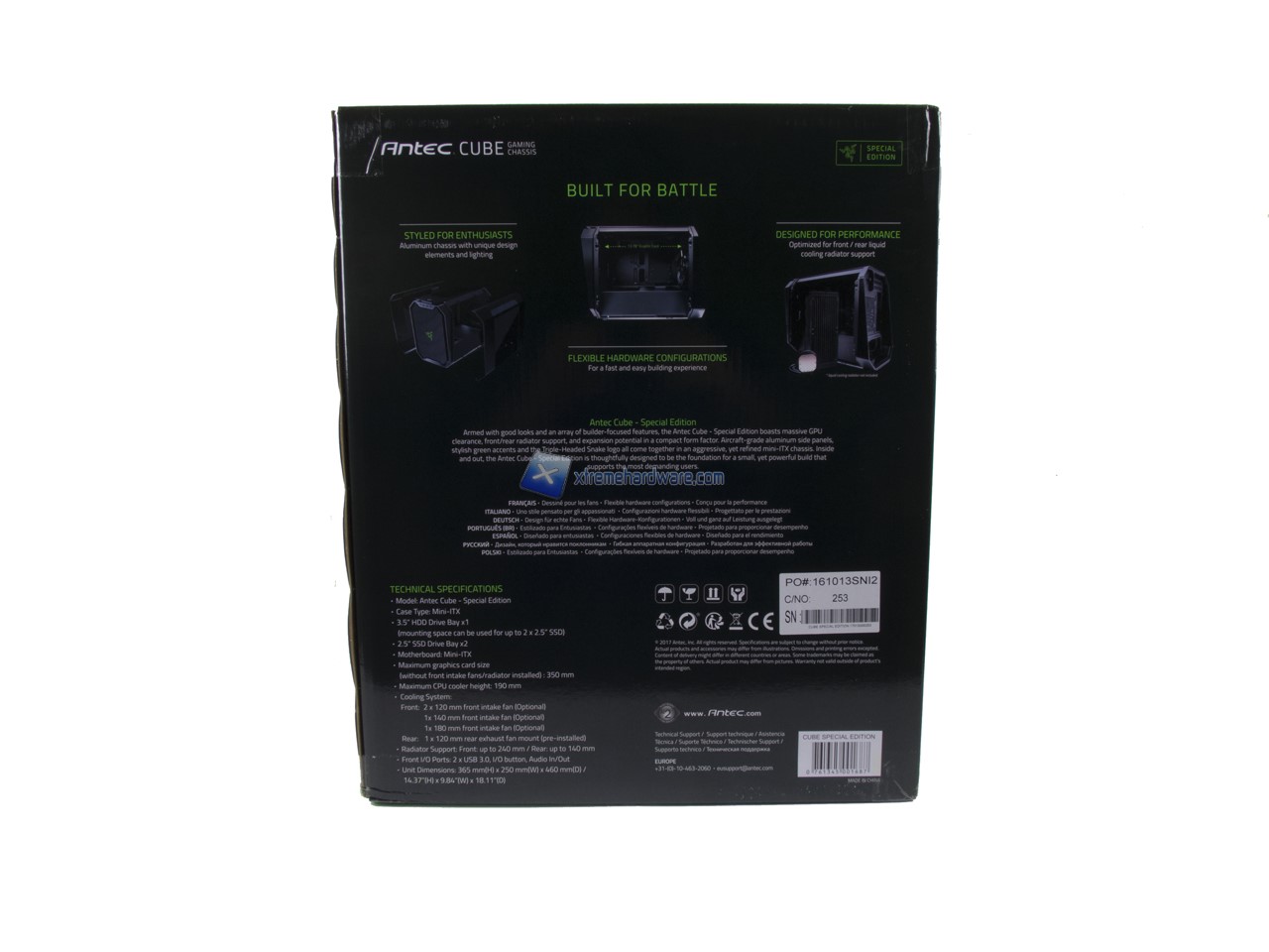 Il nostro Antec Cube Razer Edition ci giungerà in una consueta confezione di cartone con superficie lucida e a tema Razer, naturalmente, con tutte le classiche e principali immagini e informaizoni. Le dimensioni della confezione idealmente rappresentano quelle del case cubico visto che anche questa è di forma cubica/parallelepipeda che si estende verso l’alto. Il case è posto in verticale all’interno.