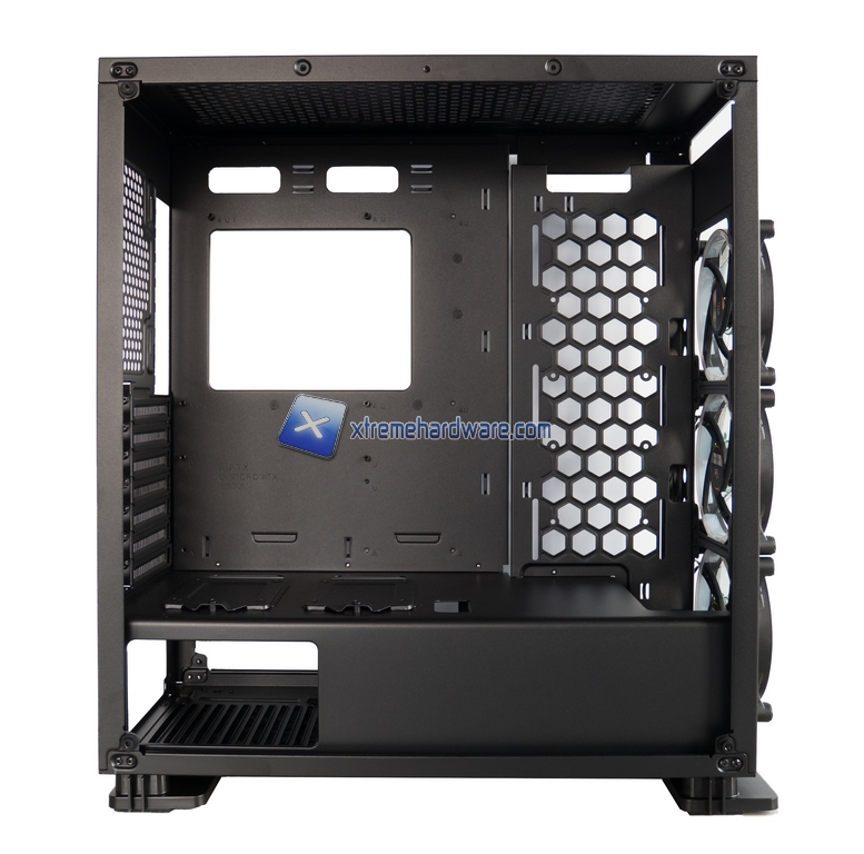 L’attenzione dei dettagli è, sotto certi aspetti, impressionante per un prodotto di questa fascia di prezzo. Entrambe le paratie laterali non poggiano direttamente sul metallo portante del case ma su occhielli in gomma, le viti di fissaggio delle paratie sono dotate anch’esse di rondelline in gomma, le slitte in plastica per gli HDD si possono utilizzare senza alcuna vite, la griglia superiore è magnetica quindi rimovibile e pulibile in pochi secondi, l’hub di connessione delle ventole ha un adesivo 3M in modo che possa essere posizionato dove serve, il sensore per il telecomando ha un filo sufficientemente lungo per muoverlo nel punto dove può garantire la piena operabilità.