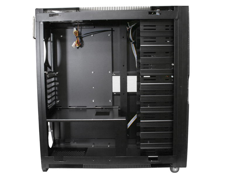 Dietro agli slot per HDD troviamo una staffa con la predisposizione per tre ventole da 120mm di diametro. L'alimentatore (o gli alimentatori) sono posizionati in basso.
