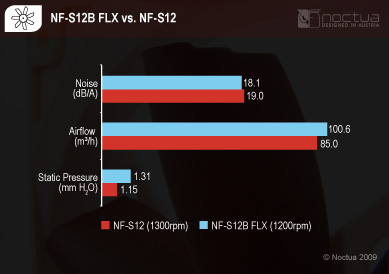La NF-S12B rispetto alla NF-S12 (qui recensita) presenta un nuovo disegno delle pale, caratterizzato da un profilo ondulato sul bordo vicino al telaio. Questo disegno permette di minimizzare le turbolenze d'aria create dagli spigoli delle pale e riesce quindi ad abbassare notevolmente il rumore prodotto dalla ventola e ad aumentare la pressione statica. Grazie anche a una lunghezza leggermente maggiore delle pale Noctua è riuscita anche a migliorarne il flusso. Due grafici presenti sulla confezione mostrano i miglioramenti ottenuti per i rapporti flusso/rumorosità e pressione/rumorosità.