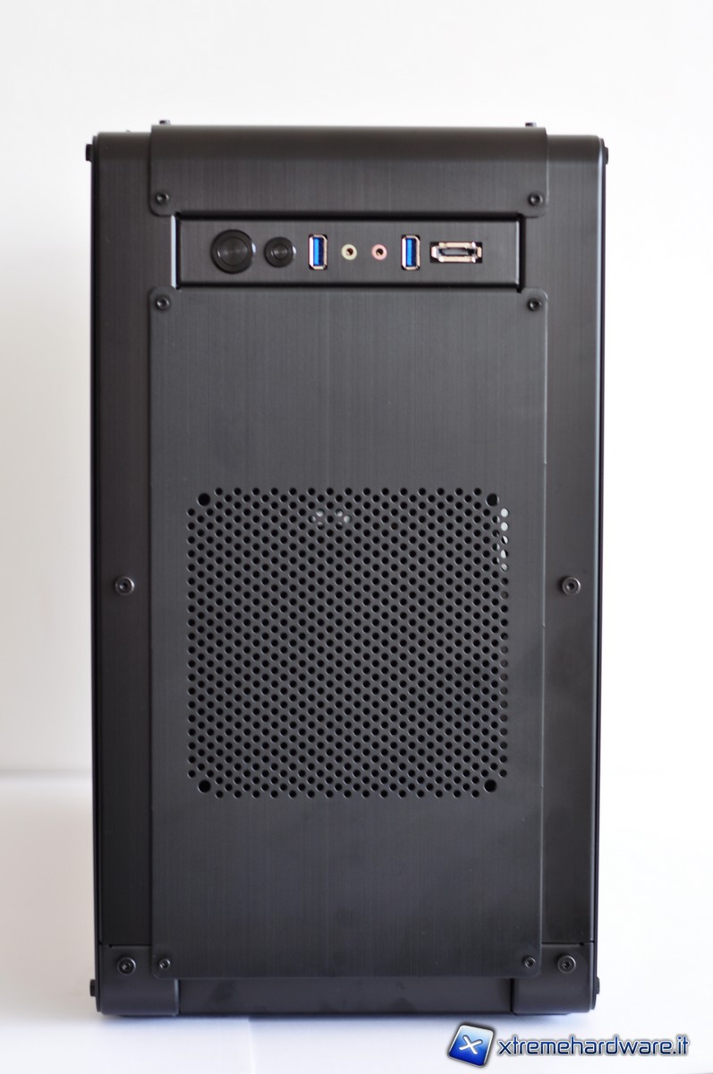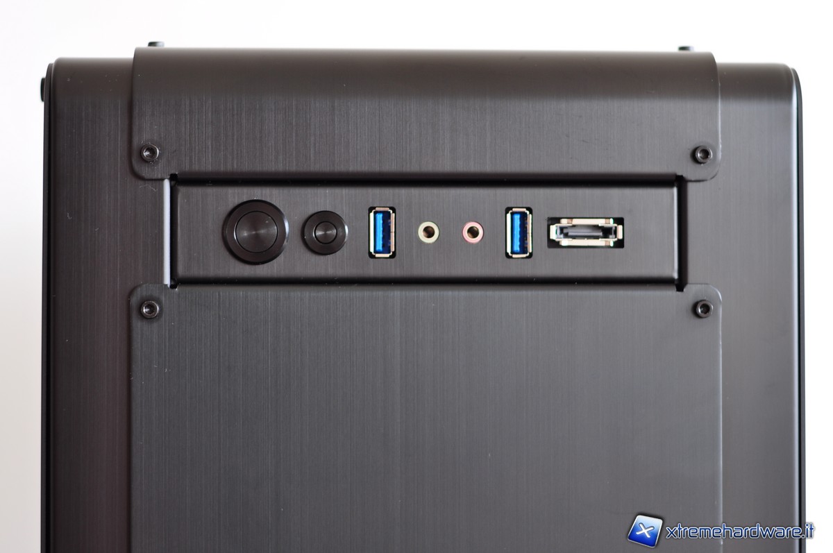 Sulla parte superiore sono presenti i pulsanti di accensione e di reset. A fianco si trovano due porte USB 3.0, due fori per le connessioni audio un jack per HD + AC97 e uno per il microfono; infine è presente anche una porta eSATA. I cavi per connettere queste porte e pulsanti sono molto lunghi, forse sarebbe il caso di dire fin troppo lunghi.