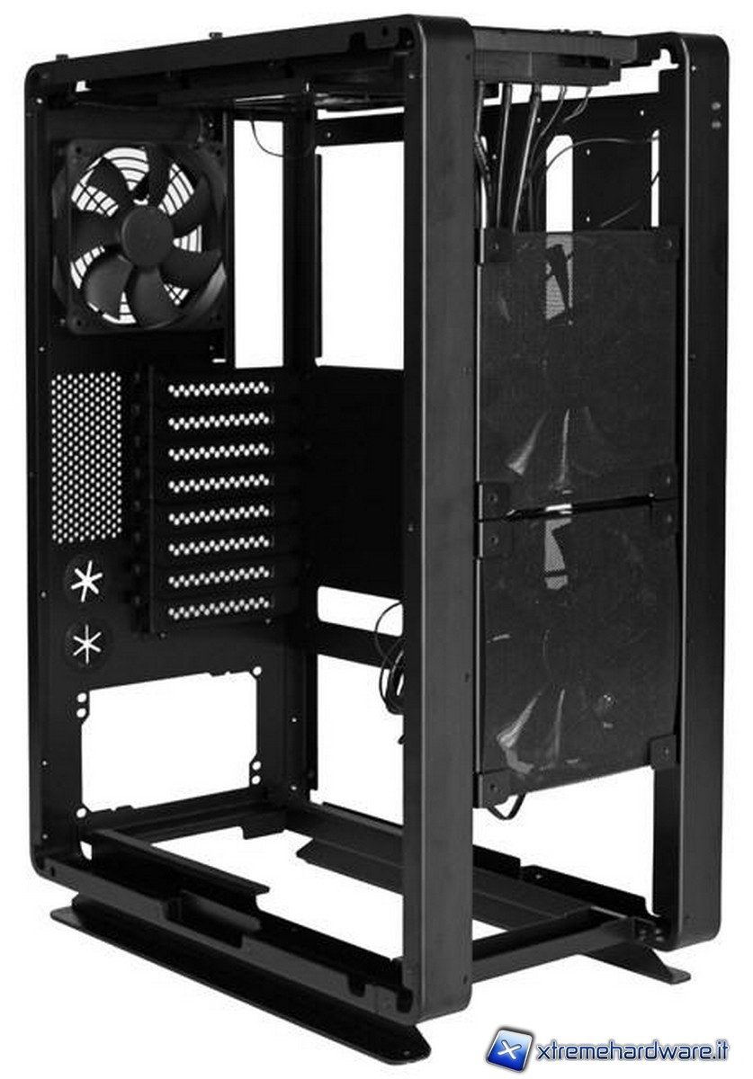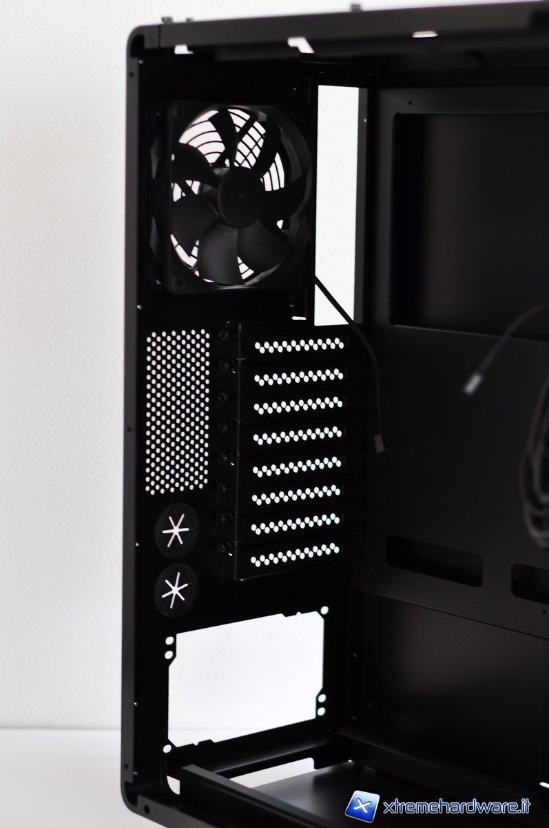 Nella parte posteriore è possibile notare i fori per il passaggio dei tubi dell’impianto a liquido con tanto di guarnizione per evitare che la lamiera possa incidere la gomma. Le piastrine copri-slot PCI sono forate (presentando un grazioso pattern di cerchi) e fissate per mezzo di comode thumbscrew.
