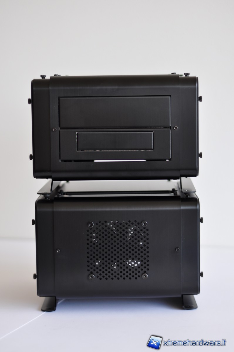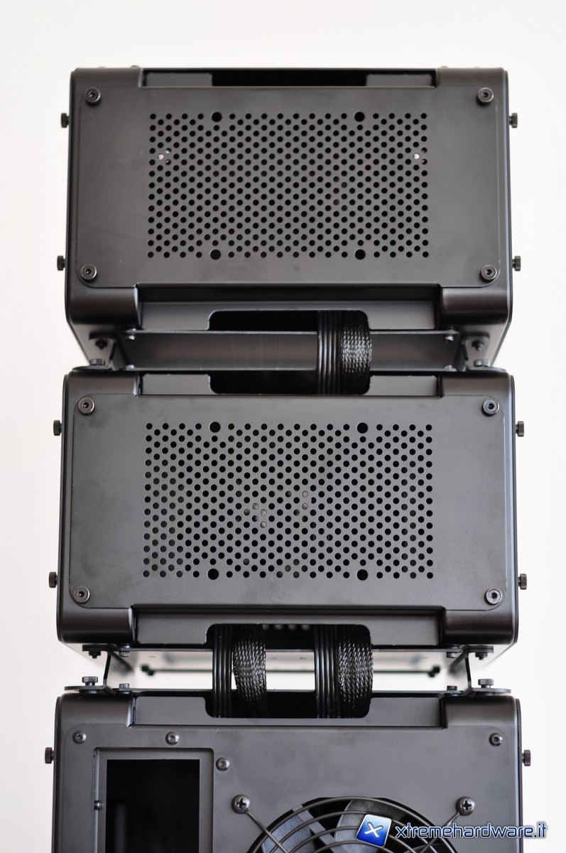 Cubitek ha ben pensato di includere i cavi specifici per consentire un’agevole connessione tra i vari moduli. I cavi da 70 cm per le connessioni SATA (sia di alimentazione sia di trasferimento dati) trovano anche degli spazi appositamente disegnati per il loro passaggio in maniera tale da rendere più pratica la connessione tra i vari moduli. In più i vari moduli presentano dei fori nei piedini e delle thumbscrew sulla paratia superiore in maniera tale da poterli fissare in pila, così da poter assemblare un vero e proprio totem tecnologico. Questi cavi-prolunga sono sleevati al fine di non compromettere l’impatto estetico del sistema. Ovviamente far passare queste prolunghe all’interno dei vari moduli, significherà, per i maniaci del cablaggio, avere dei fastidiosi cavi in disordine e che possono anche dare fastidio alle operazioni di manutenzione dell’hardware. Del resto, un piccolo scotto per ottenere questo grande beneficio della modularità del  sistema lo si deve pur pagare.