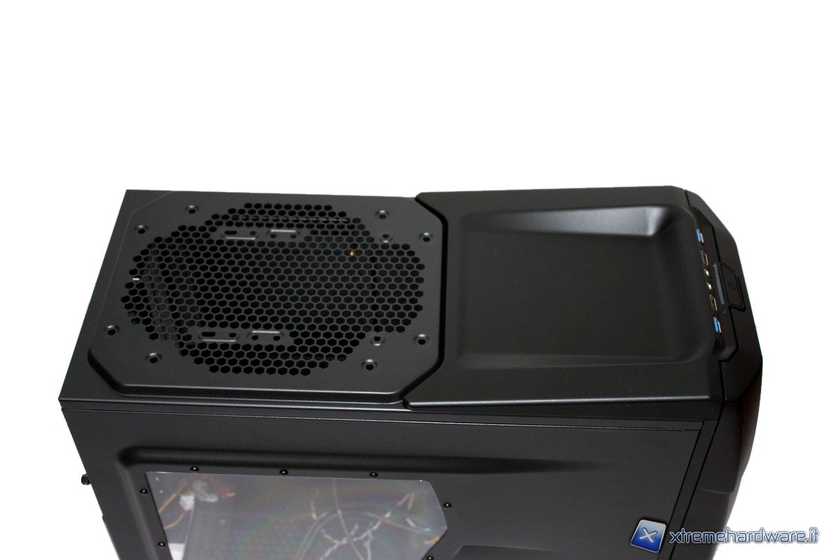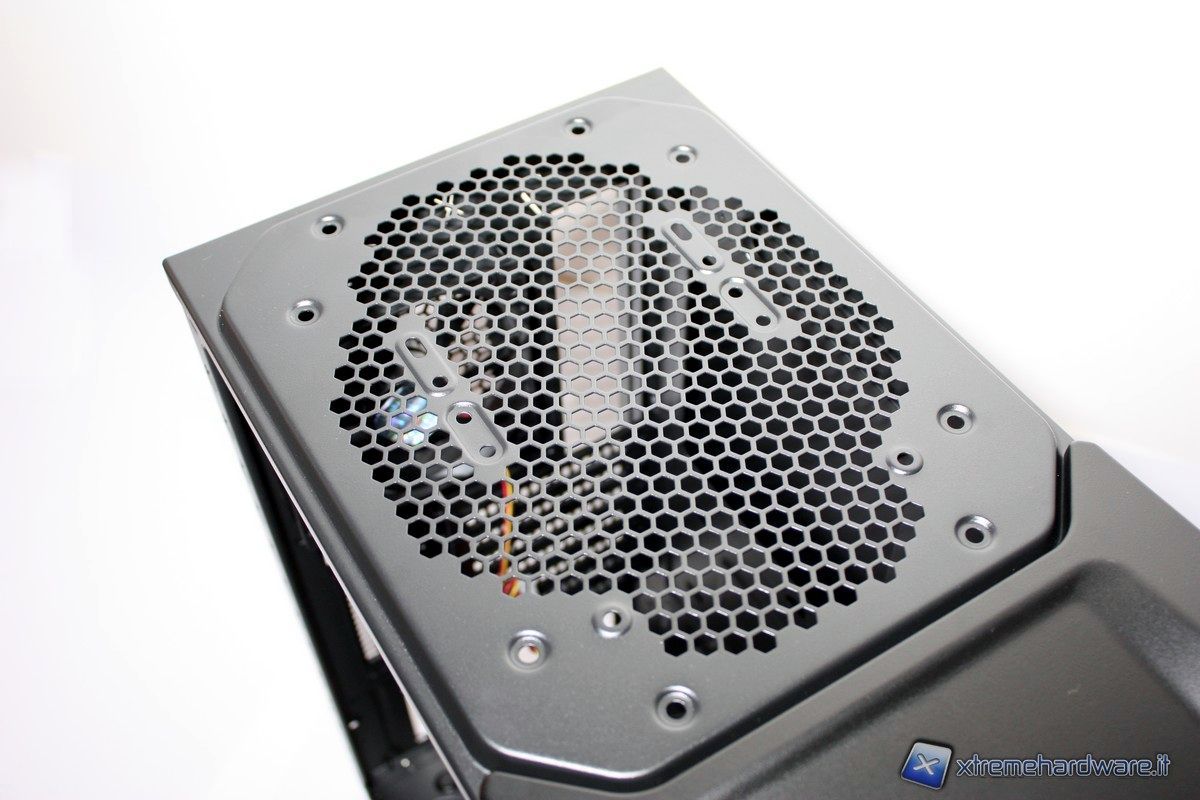 Posteriormente invece è presente un'enorme griglia adatta ad ospitare una ventola da 200mm o due da 120mm. Tali ventole non sono fornite in dotazione; assenti anche eventuali filtri antipolvere. Ovviamente su tale griglia sarà possibile installare anche un radiatore di un impianto a liquido, infatti il case è stato progettato anche per questo tipo di soluzione come vedremo successivamente.