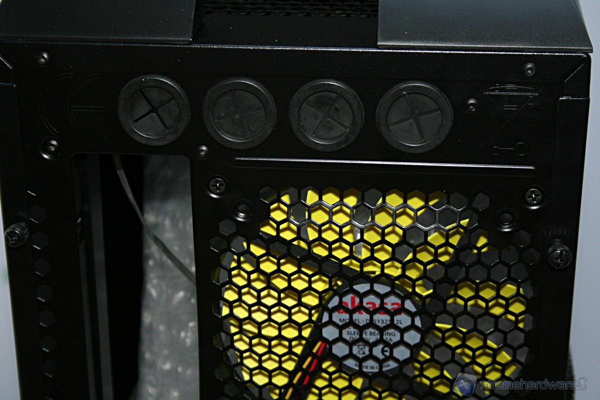 L’organizzazione del case, posteriormente, è classica, sebbene però troviamo degli spunti interessanti ovvero uno spessore laterale davvero pronunciato (che permetterà l’installazione di dissipatori molto ingombranti in altezza), ben quattro fori per il passaggio di sistemi a liquido e una ventola da 140mm in estrazione. Sono presenti numerosi fori di ventilazione, sia sui copri-slot PCI proprietari di Akasa, sia sulla parte laterale e centrale. La posizione dell’alimentatore è come di consueto in basso. Al di sotto di esso troviamo un comodissimo filtro antipolvere, la cui rimozione è facilitata da un sistema a scorrimento orizzontale. Ottima comunque sia la finitura che la solidità strutturale.