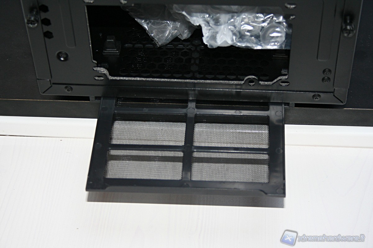 In basso abbiamo 4 ottimi supporti gommati antivibrazione, due sottili paratie ventilate per l’alimentatore e la parte inferiore del cabinet; in merito a quest’ultima troviamo i fori per l’installazione superiore di una ventola da 120mm, con annesso filtro rimovibile, però solo tramite l’ausilio di viti. Per quanto riguarda invece la porzione sottostante l’alimentatore, è presente un filtro che può essere fatto scorrere orizzontalmente per essere pulito. Non è possibile montare rotelle per lo spostamento del case. Infine nella parte frontale ed inferiore della base è presente un piccolo foro, dal quale possiamo rimuovere la paratia anteriore, per il montaggio delle periferiche da 5.25’’.