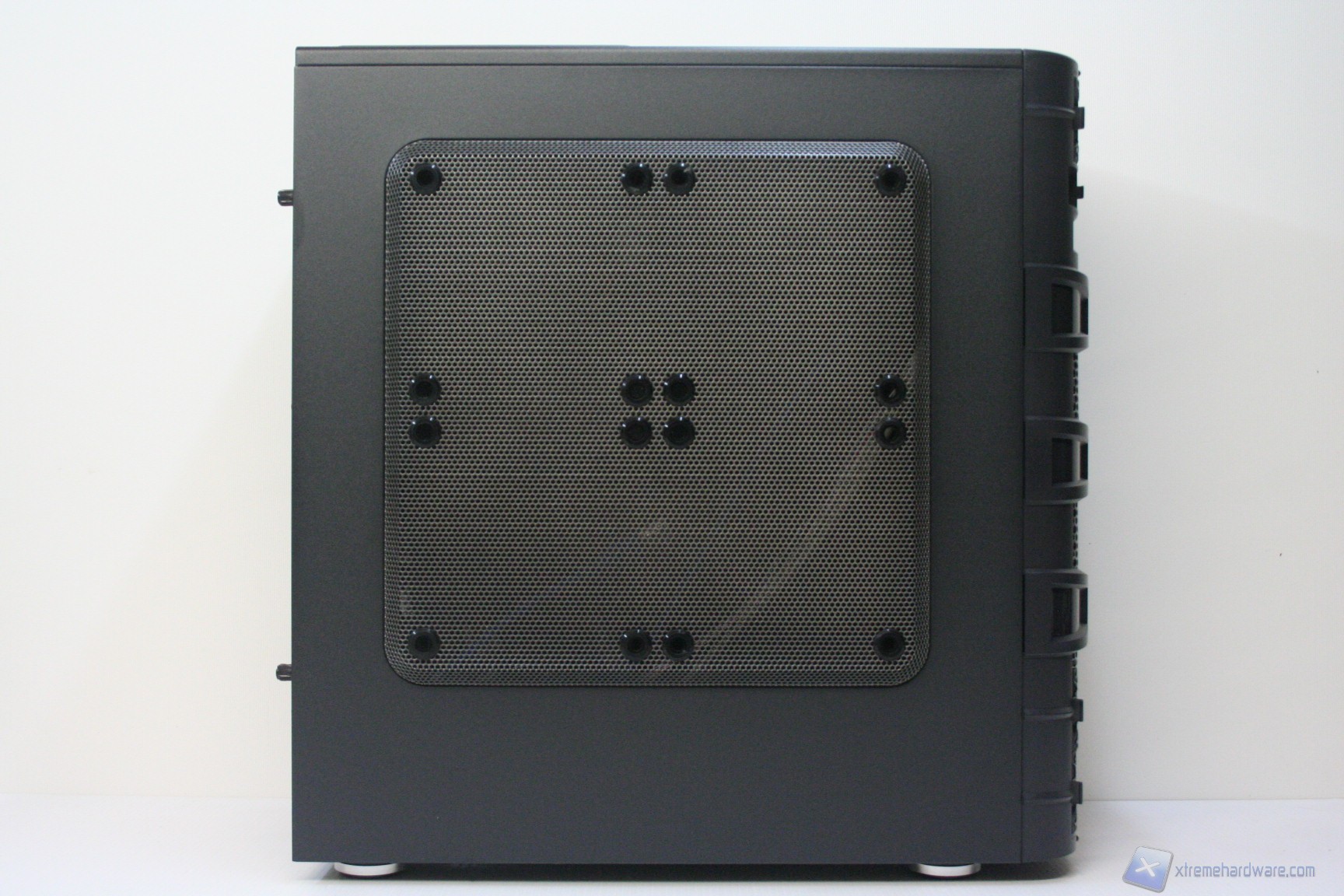 La configurazione è classica, con quattro piedi di supporto circolari; non sarà possibile installare delle rotelle ed è presente un’unica feritoia di ventilazione in prossimità dell’alimentatore, su cui è installato un filtro antipolvere, removibile dall’interno (sarà necessario smontare l’alimentatore però, purtroppo). Non c’è nessun supporto per cage di hard disk addizionali o ventole accessorie. Data l’altezza contenuta sarà sconsigliabile l’utilizzo con moquette o tappeto, anche se i distanziatori sono di altezza superiore allo standard e quindi in un certo senso favoriscono il pescaggio dell’aria dal basso. All’atto pratico però è consigliabile sempre porre il cabinet su di una superficie piana, senza ostacoli al flusso d’aria.