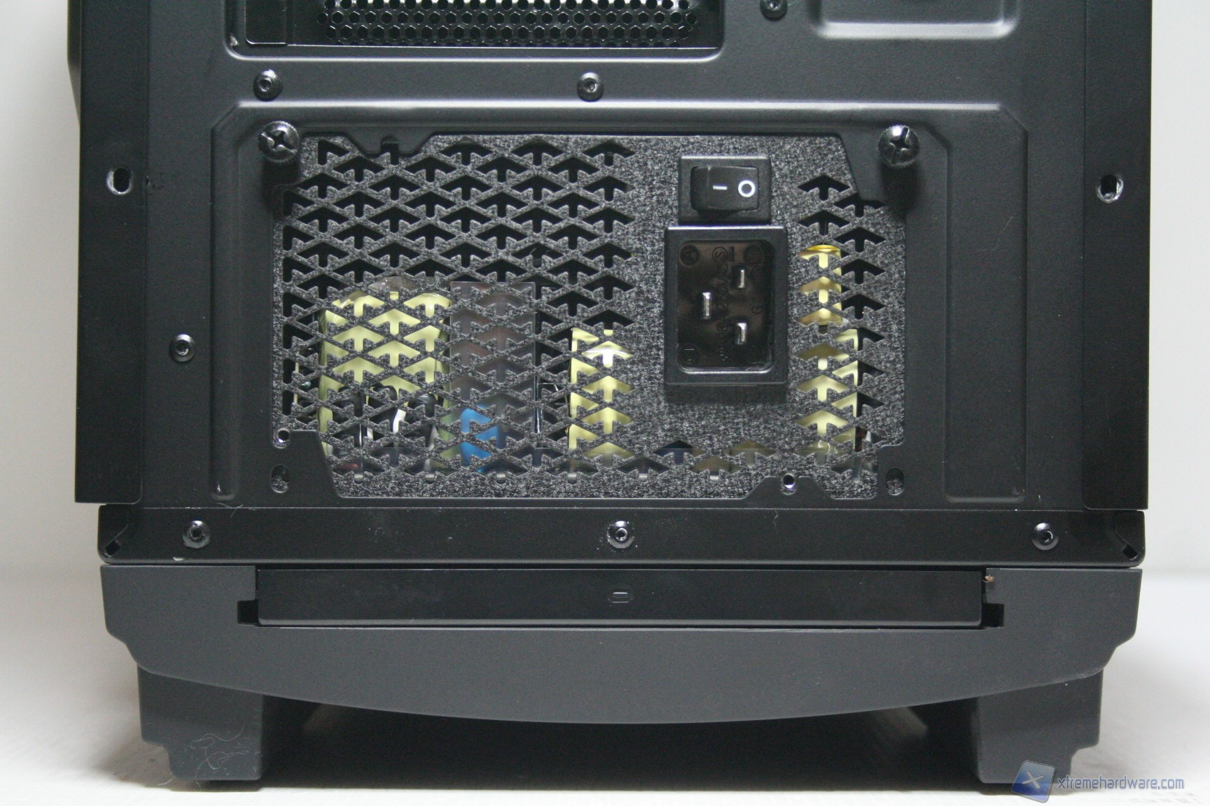 La configurazione in questo caso è classica, perlomeno per quanto riguarda il posizionamento dell’alimentatore, posteriore. Al di sotto di quest’ultimo è presente un comodissimo filtro antipolvere estraibile da dietro, ed un secondo da davanti per le ventole opzionali. Frontalmente troviamo il supporto in acciaio precedentemente menzionato, di qualità eccelsa e dalla lavorazione impeccabile. Dona una forte rigidità alla struttura, ed il design moderno certamente permette al cabinet di brillare di luce propria, a maggior ragione data la presenza del sistema HUE! Come piedi di supporto troviamo due superfici orizzontali isolanti per le vibrazioni, oltre alla struttura in acciaio frontale che svolge ovviamente la stessa funzione, presentando anch’essa dei gommini antivibrazione. Non è possibile installare rotelle. Una menzione particolare va al supporto per il cage inferiore degli hard disk, che però è removibile dall’interno; è possibile ovviamente installare ventole accessorie, dalla parte inferiore, come vedremo nel capitolo dell’installazione dei sistemi a liquido. I supporti permettono una buona altezza dal terreno, ben superiore allo standard, favorendo il pescaggio di aria dal basso; da notare che l’ingresso della polvere sarà limitato dai filtri posti alla base. E’ quindi possibile posizionare il cabinet anche su una moquette o un tappeto.