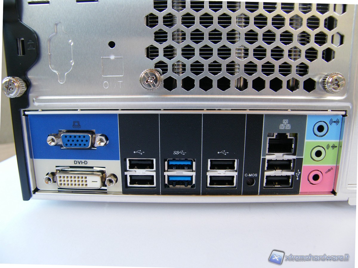 Analizzando la parte posteriore del PC, la mascherina della scheda madre si presenta con diverse connessioni ed uscite video. In particolare abbiamo un uscita D-Sub VGA ed una DVI-D, 6 porte USB 2.0, 2 porte USB 3.0, una porta GigaBit LAN (RJ45), le uscite analogiche con connettori da 3,5 mm per i 6 canali audio: Front Line out (cuffie), Rear Surround line-out,  Center line-out line-out . E' possibile inserire una porta seriale (RS-232)  opzionale. Infine è possibile avere accesso al pulsante Clear CMOS.