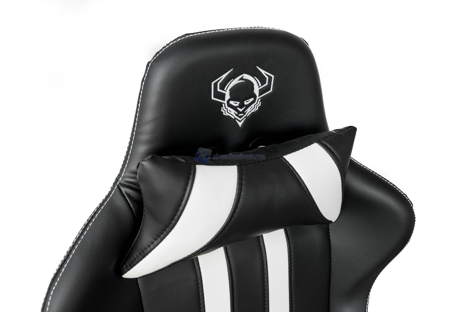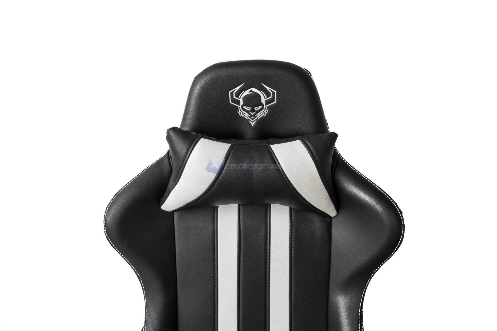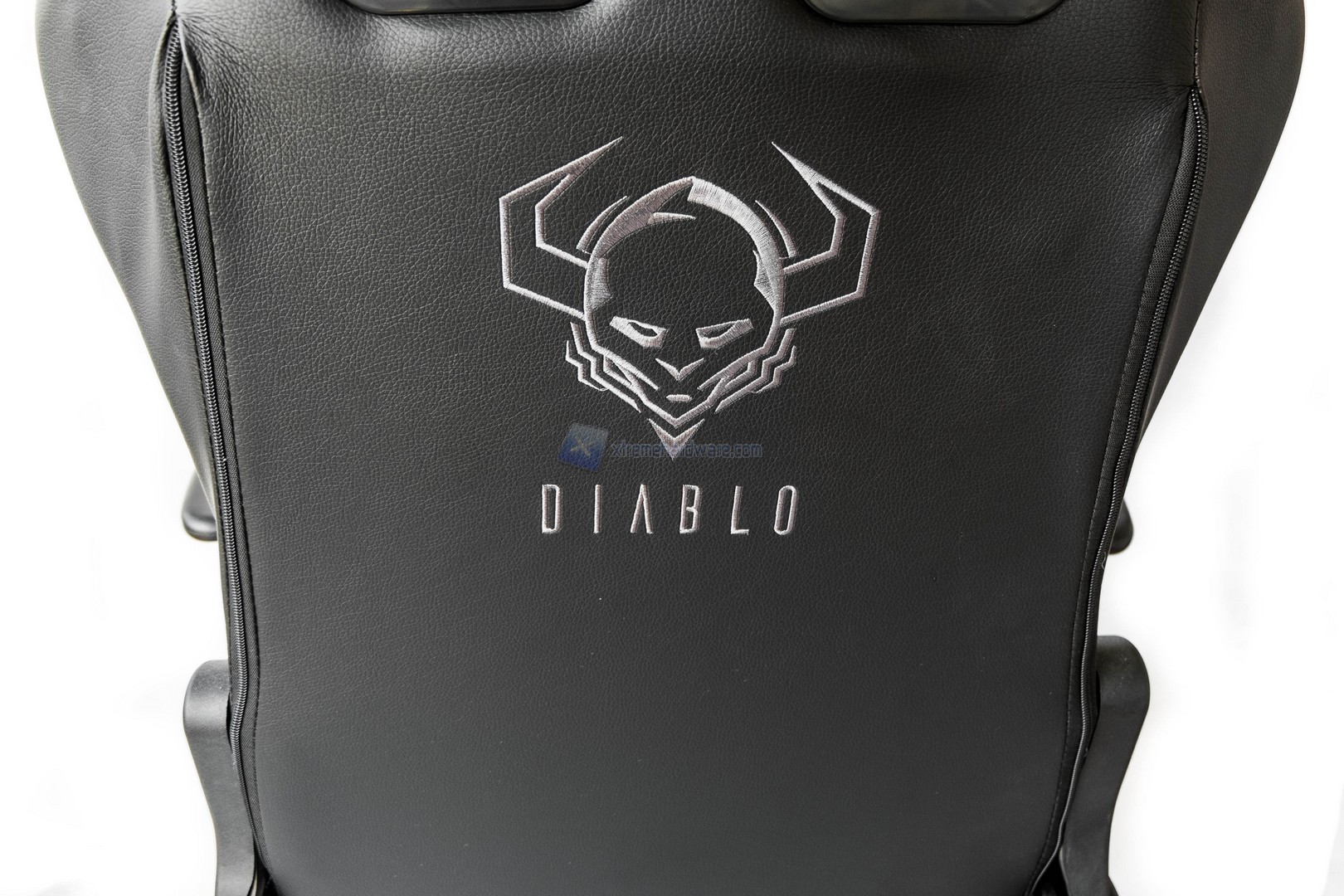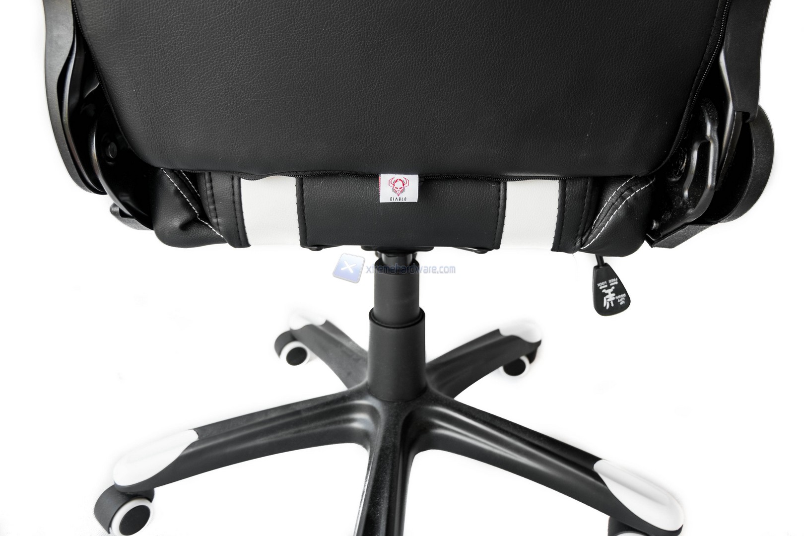 Iniziamo la nostra analisi del prodotto partendo dallo schienale. La X-One non presenta un cuscino integrato nel poggiatesta, ma dovremo legare a quest’ultimo il cuscino cervicale dato in dotazione, che si dimostra abbastanza soffice ed ergonomico. Sul poggiatesta è presente il logo dell’azienda, in questo modello ricamato e non stampato, particolare che fa emergere la cura per il dettaglio riservata alla X-One. Scorrendo poco più in basso sono presenti due fori ripresi dai sedili da corsa, ma che in questo caso hanno una funzione ben diversa. Infatti nella variante da pista servono per far passare le cinture da gara, mentre nel nostro caso servono per allacciare i due cuscini in dotazione nella zona posteriore dello schienale grazie a degli elastici. Lo schienale è abbastanza ampio, difatti risulterà comodo anche per le persone di una certa stazza, inoltre è rivestito in similpelle che regala un’ottima sensazione di qualità. La parte interna dello schienale presenta due strisce verticali bianche, che spezzano la monotonia del design e rendono il prodotto più dinamico ed interessante. Il rivestimento dello schienale, anche non facilmente, è estraibile e lavabile, grazie alla presenza di una zip, infine ha un angolo di inclinazione che va dai 90° ai 180°. La regolazione dell’angolo a 180° ci permetterà di rilassarci e schiacciare un pisolino. L’inclinazione ha una duplice regolazione, infatti può essere bloccata o sbloccata grazie ad una leva posizionata sul lato destro, inoltre può essereregolata la forza necessaria per inclinare lo schienale grazie ad una manopola collocata sotto la seduta. Posteriormente troviamo il logo Diablo e una piccola etichetta riportante il logo dell’azienda. I lati dello schienale sono ancorati alla seduta tramite dei montanti in acciaio, rivestiti da delle parti in plastica per migliorarne il design.