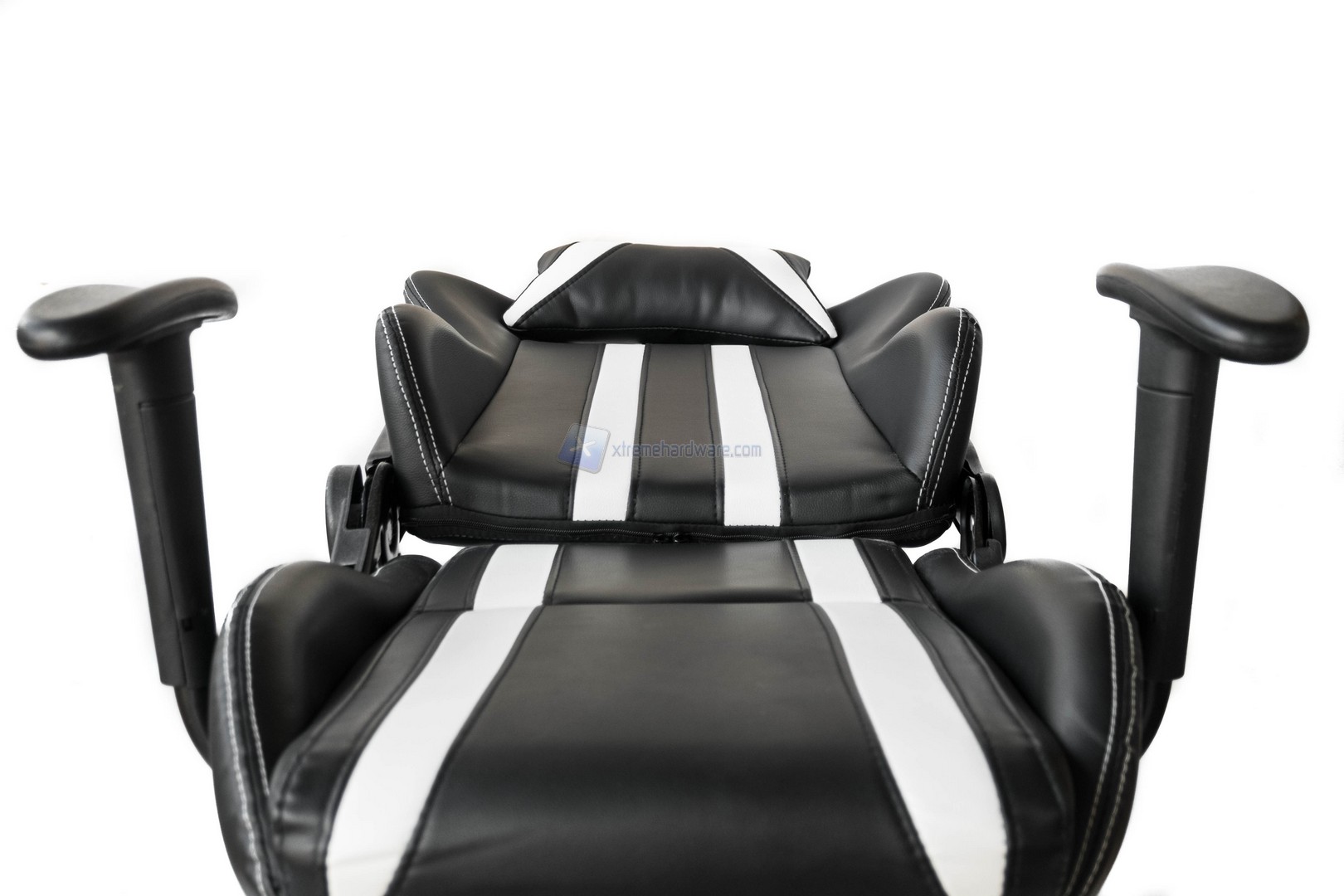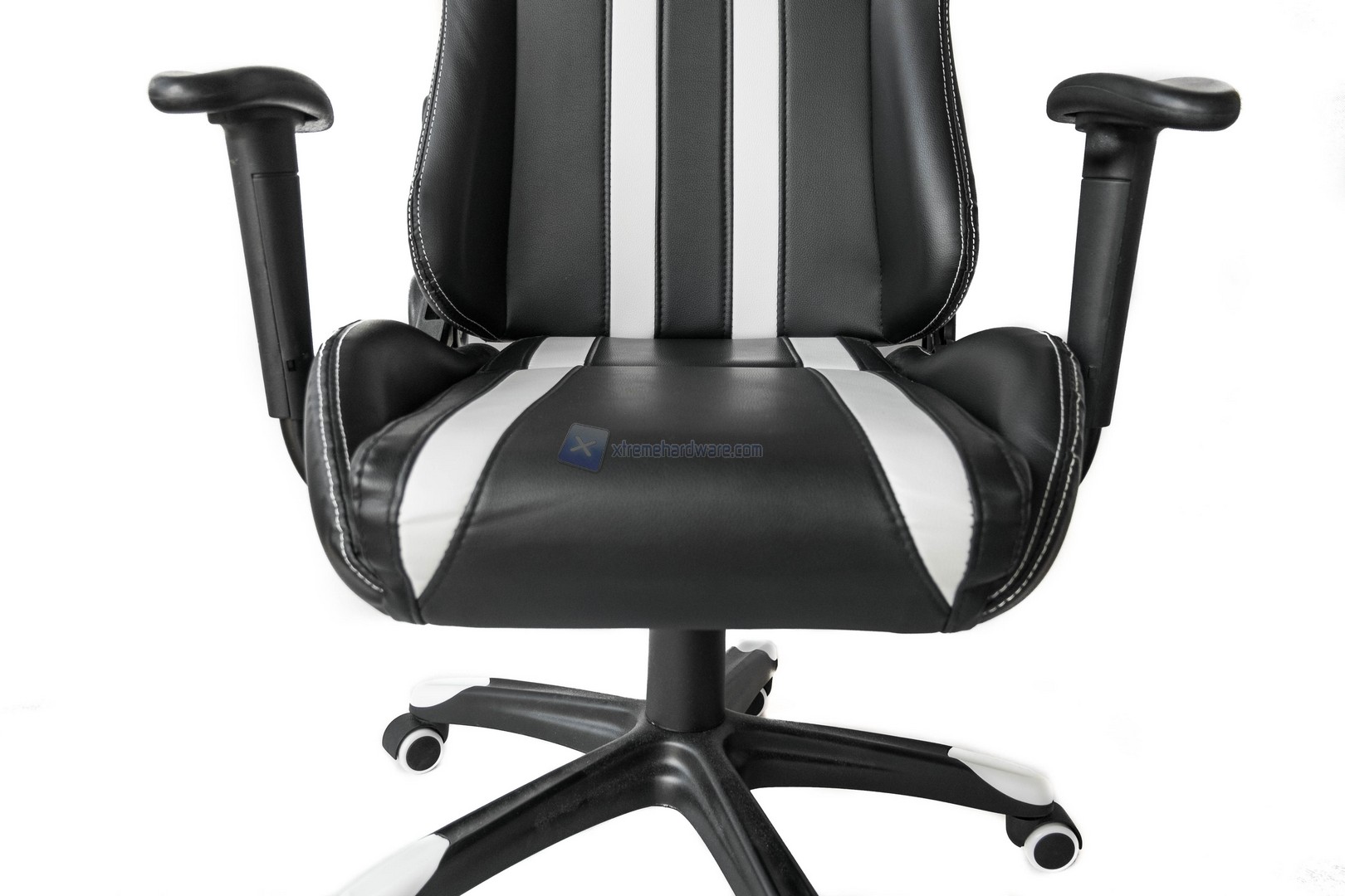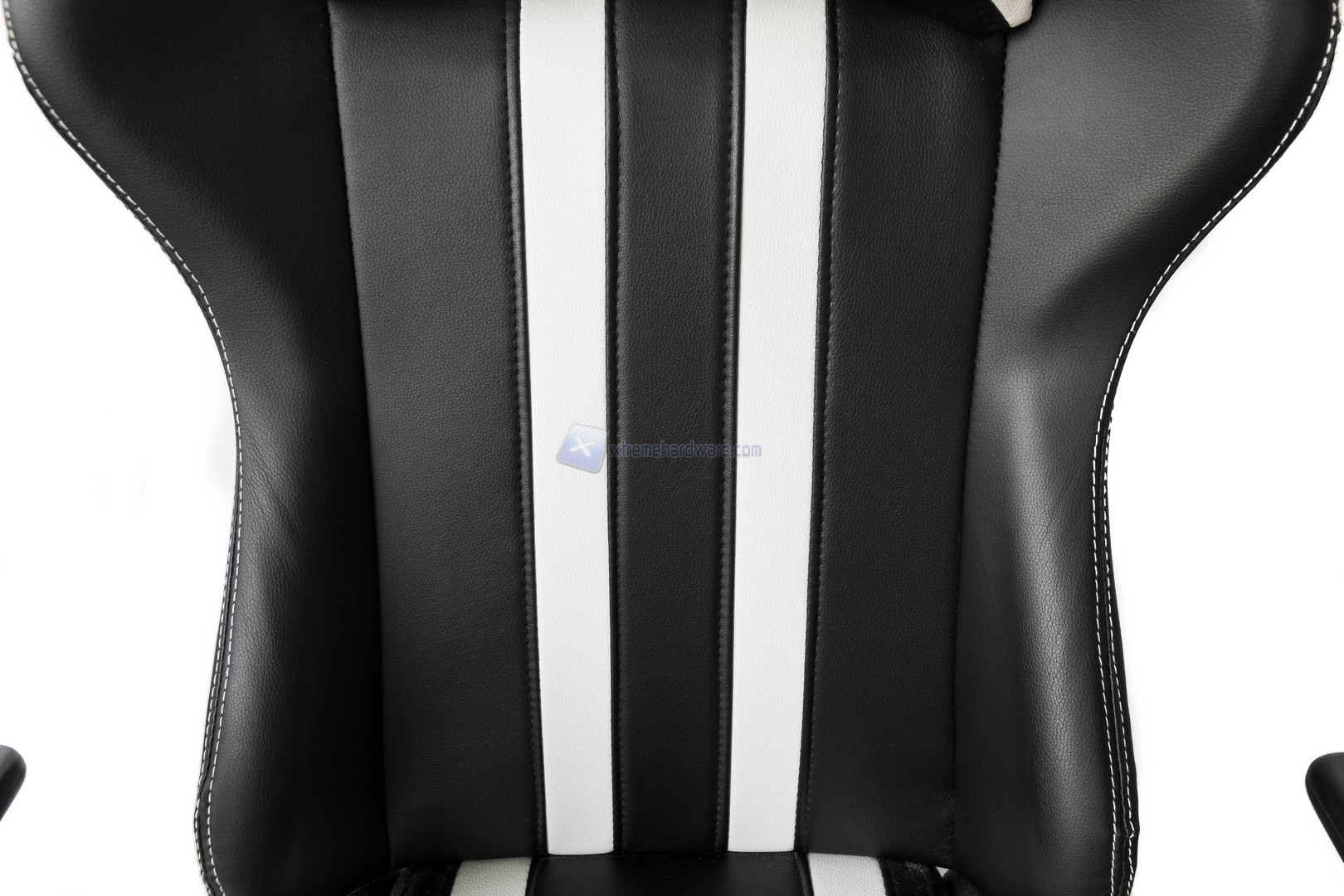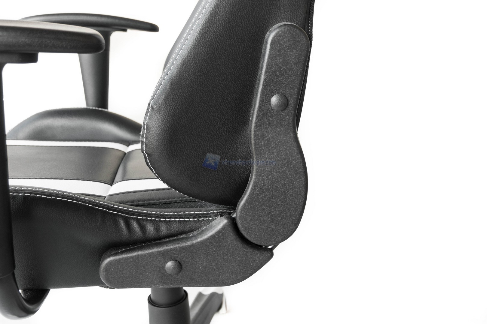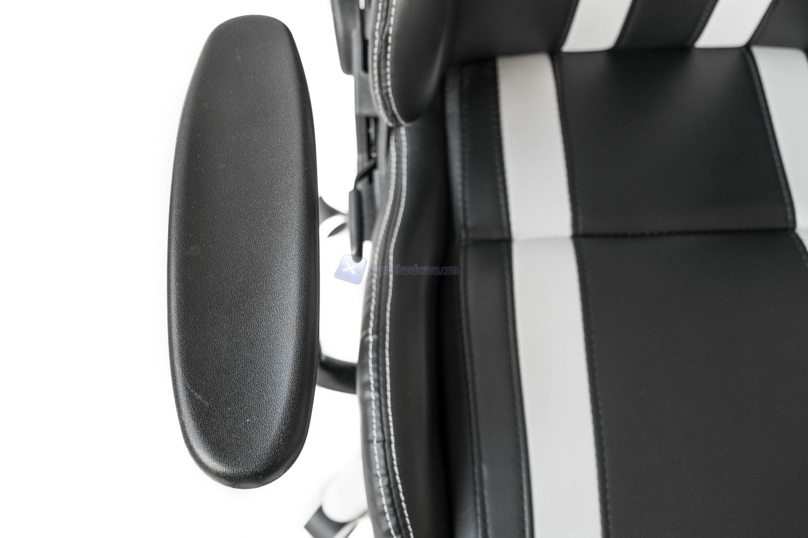 La seduta si presente più contenuta rispetto alla X-Fighter, ma rimanendo comunque sufficientemente ampia da ospitare la maggior parte degli utenti. Quest’ultima presenta lo stesso design a doppia striscia bianca visto sullo schienale, ma offre un’imbottitura maggiore per restituire il migliore comfort possibile. I braccioli sono fissi in altezza, profondità e angolazione, ma propongono una buona imbottitura in gomma. L’altezza della seduta è personalizzabile grazie alla presenza di una leva posizionata sulla destra, che permette di variare dai 47 ai 54 cm d’altezza. I fianchetti sono ben imbottiti ed avvolgenti.
