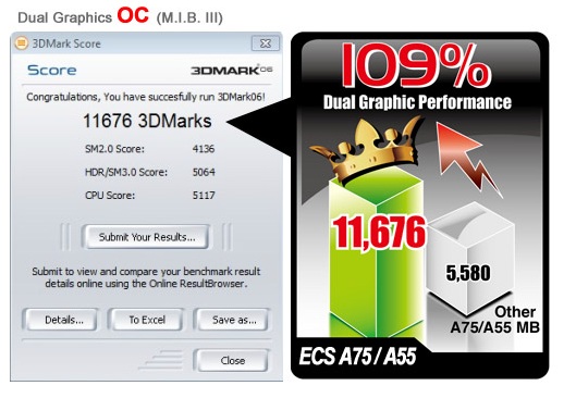 Grazie alla tecnologia Dual Graphics abbinata ad una scheda madre ECS dotata di chipset A75/A55, godremo di un incremento delle performance del 109% circa.