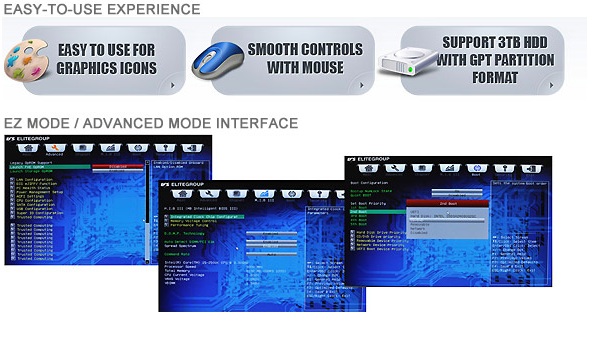 L'ECS A55F-A2 è dotata di UEFI BIOS, un BIOS avente una comoda e semplice interfaccia grafica che aiuta l'utente nella configurazione della scheda madre anche grazie al supporto del mouse oltre che della tastiera.