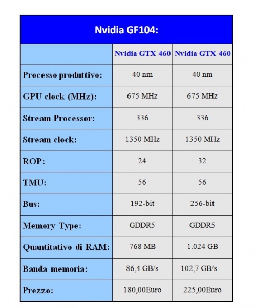 Riassumiamo nella tabella sottostante tutte le caratteristiche tecniche delle due soluzioni Nvidia GF104: