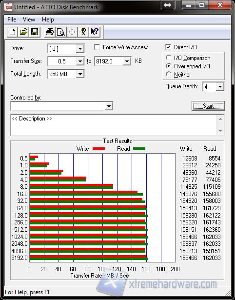 Anche ATTO Disk conferma quanto registrato nel test precedente, la media si assesta intorno ai 160MB/s.