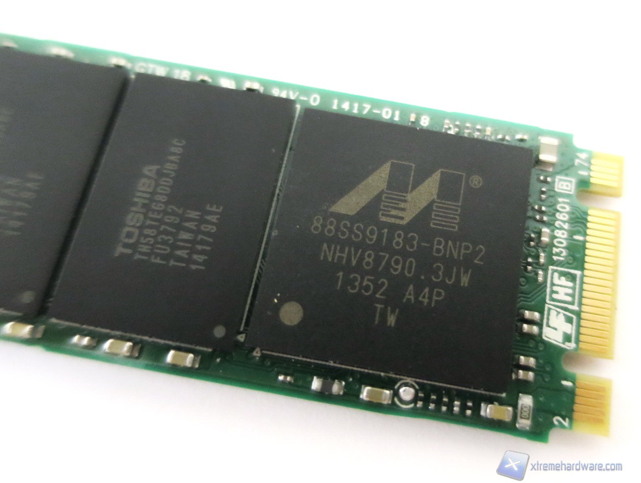 Passando ad analizzare la NAND troviamo otto chip di memoria con sigla TH58TEG8DDJBA8C, i quali sono prodotti sempre da Toshiba con processo litografico a 19nm e con una densità di 256Gbit (32GB). Tali NAND Flash utilizzano una configurazione MLC (Multi Level Cell), con package del tipo 132 BGA e sono conformi allo standard DDR Toggle Mode 2.0 con un lifetime stimato in circa 3.000 cicli di scrittura.
