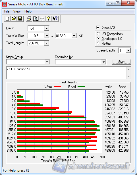 Atto è un benchmark gratuito che esegue dei semplici test in lettura e in scrittura in modalità sequenziale adoperando una Queue Depth (file in coda) di 4.