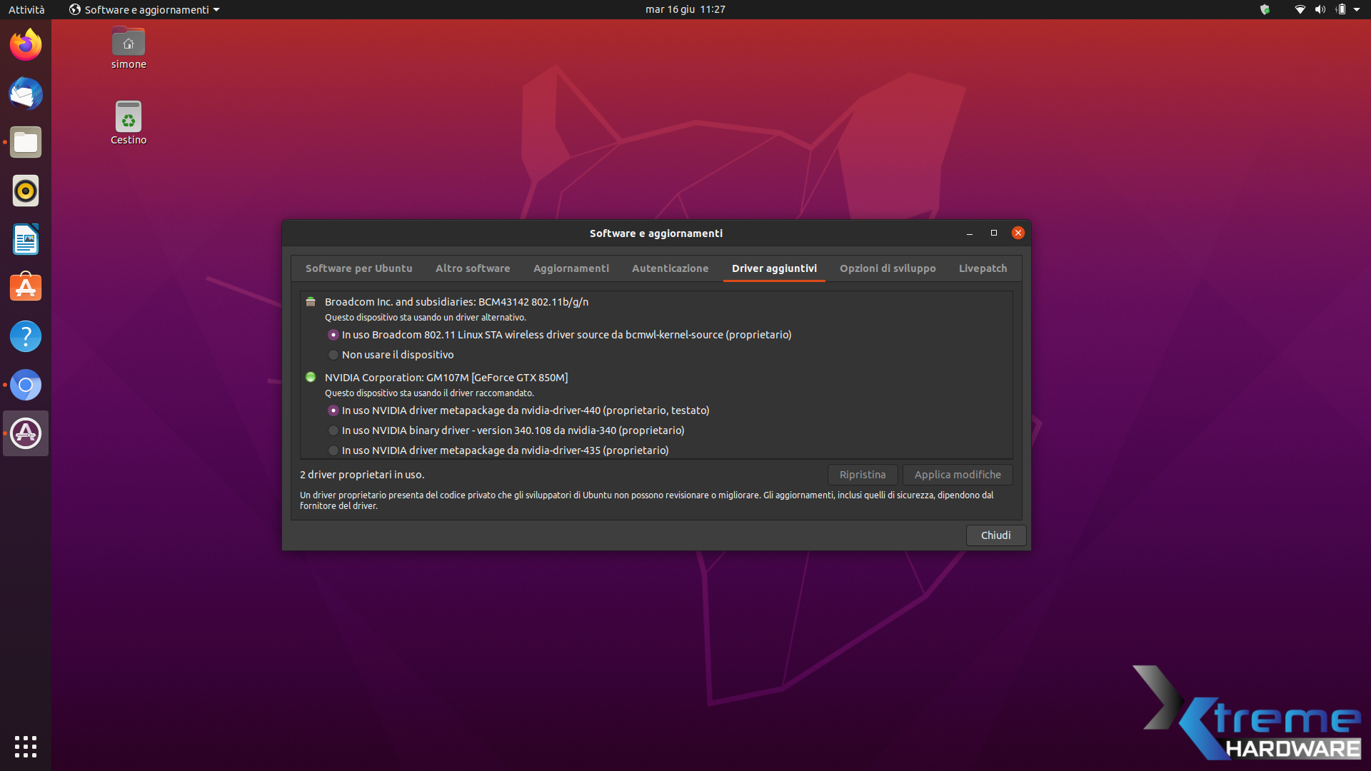 Dopo un primo sguardo all’aspetto estetico proposto da Ubuntu è il momento di verificare che tutto funzioni a dovere. La prima cosa che notiamo è che la schede WiFi del nostro Laptop non viene rilevata automaticamente dal Sistema, probabilmente necessita di Driver proprietari per funzionare. Per fortuna Ubuntu non è particolarmente schizzinosa in questo senso e aprendo l’applicazione Driver Aggiuntivi vediamo che sia la scheda WiFi che la GPU Nvidia possono essere abilitate mediante l’uso di Driver Proprietario.